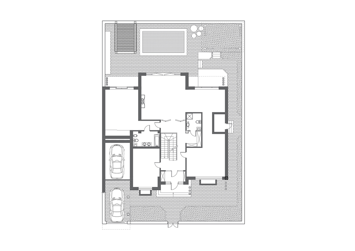 The private house with the adjacent plot is made in high-tech style. White cladding bricks were used for the facade, WPC panels of golden oak, metal and wenge wood in combination with panoramic glazing were used. The facade of the house has a strict geometric shape. The site is compactly located carport, summer kitchen area, swimming pool and minimalist landscape compositions along the perimeter of the site