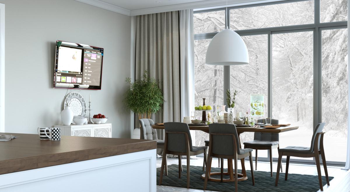 Behind the island is a large dining table with a panoramic view of the courtyard. A table and chairs for a dining area made of wood, a seat and the back of chairs made of soft, graphite gray textile that gives the room a certain mood of comfort and warmth.