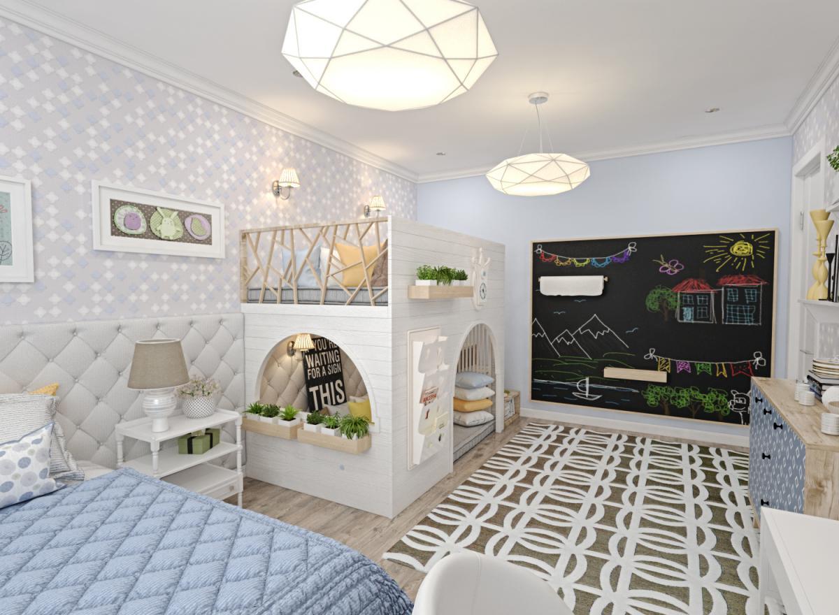 Children's rooms in the house are filled with light. To make children cozy and warm, we used several types of lighting: the main light in the form of ceiling spots, a decorative lamp and additional lights. Almost all the lamps in the nurseries are made of composite material and resemble an air cloud with a pleasant warm glow. On the walls we used painting and graphite boards for free creativity. Another must-have bedroom accessory is carpets. In each room we tried to pick up a carpet with the appropriate ornament.