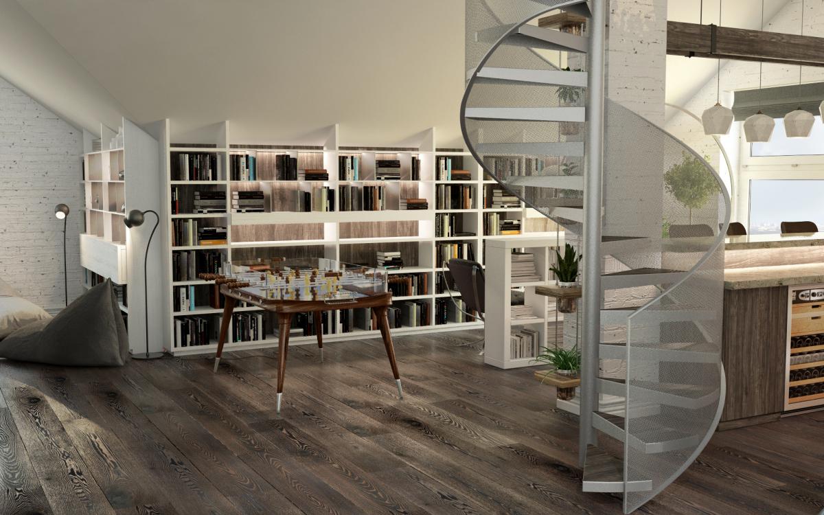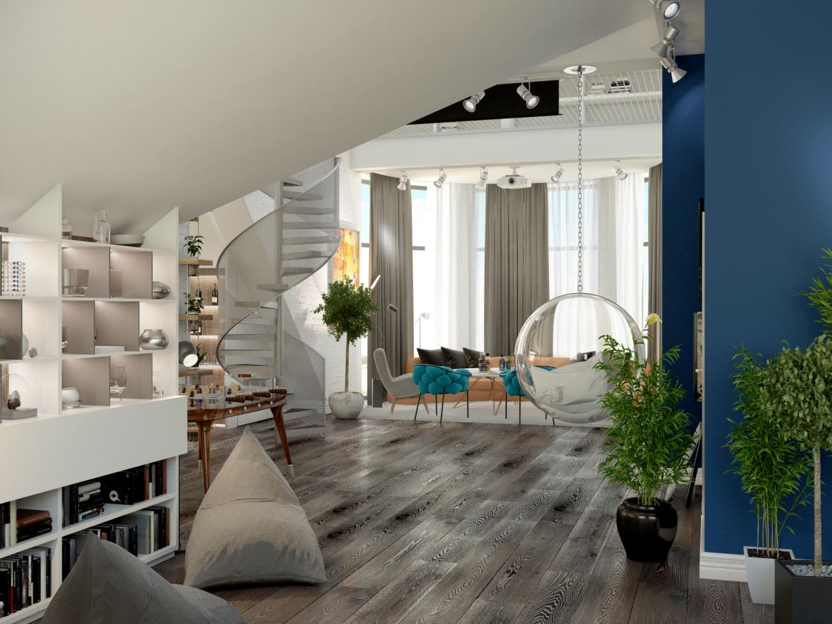 On the last attic floor there is also a corner for both the child and the adult. Here we have placed a study, archive, lounge area, bar and even a hammock. The style of the attic floor is close to the loft; the place itself has set us up to this style. We filled the space to the maximum, engaged every corner and did not even miss the opportunity to hang the Bubble chair art armchair on the beam.