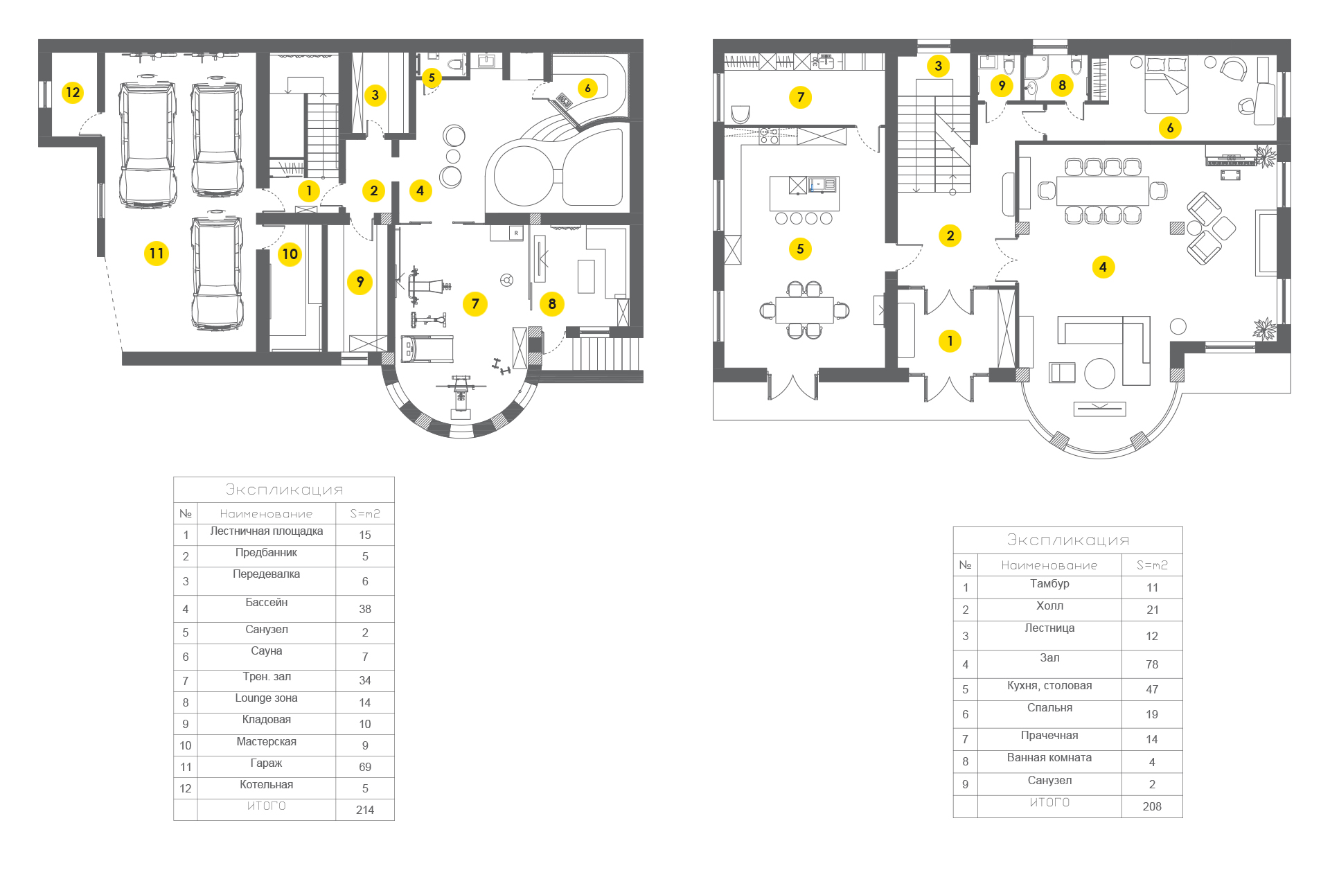 In the basement there is a sauna, a garage, a gym with a dressing room, a lounge area and a utility room. Here are the real abundance of finishing materials: laminate, tile, paint, brick, wood, metal and even stabilized moss. In the garage, we have provided all sorts of places for storing sports equipment and household items.