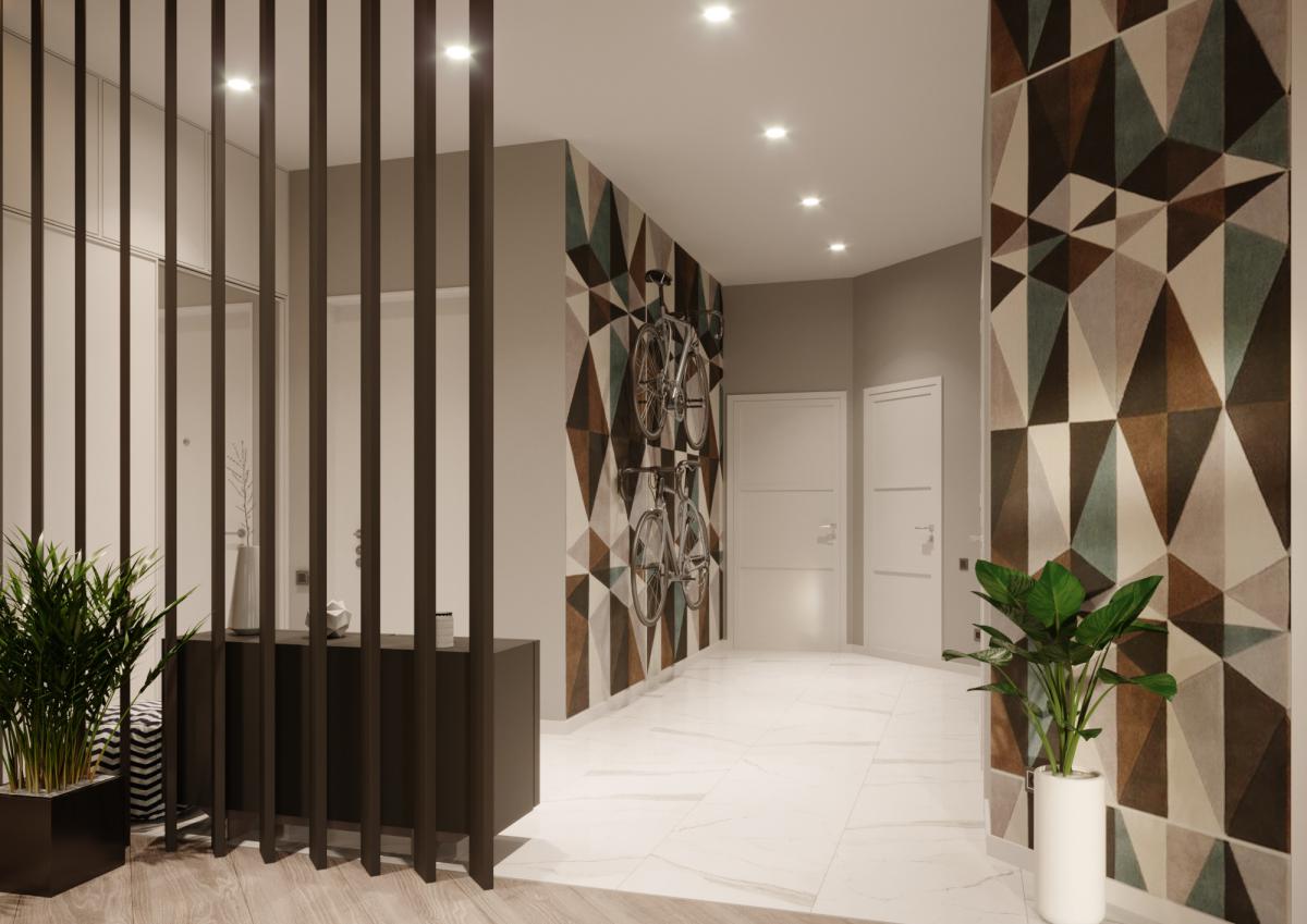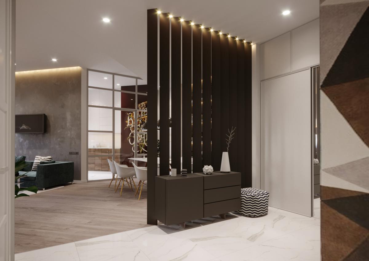 More: in terms of the apartment has a non-standard form and the task before us was to make each room ergonomic and functional. The hall and dining area are combined, the working area of the kitchen is separated by a glass partition, which creates the illusion of a holistic space.