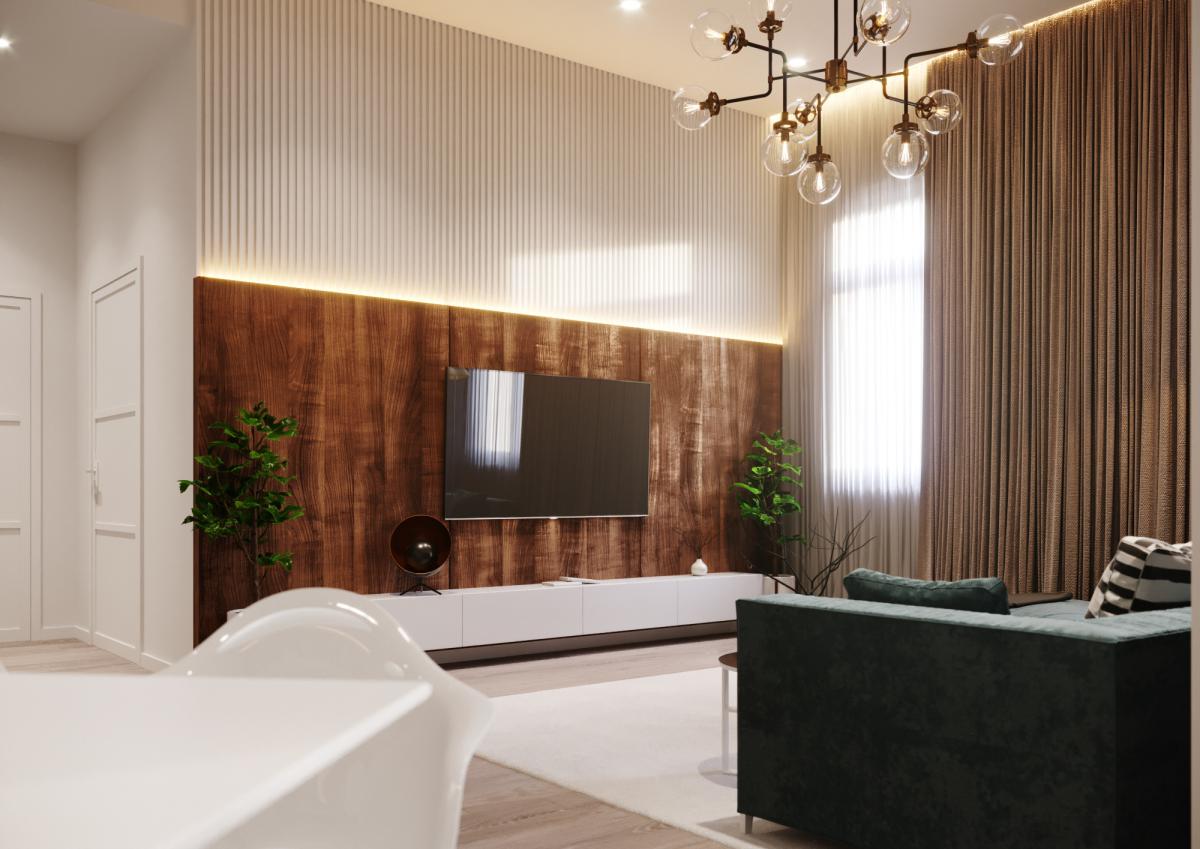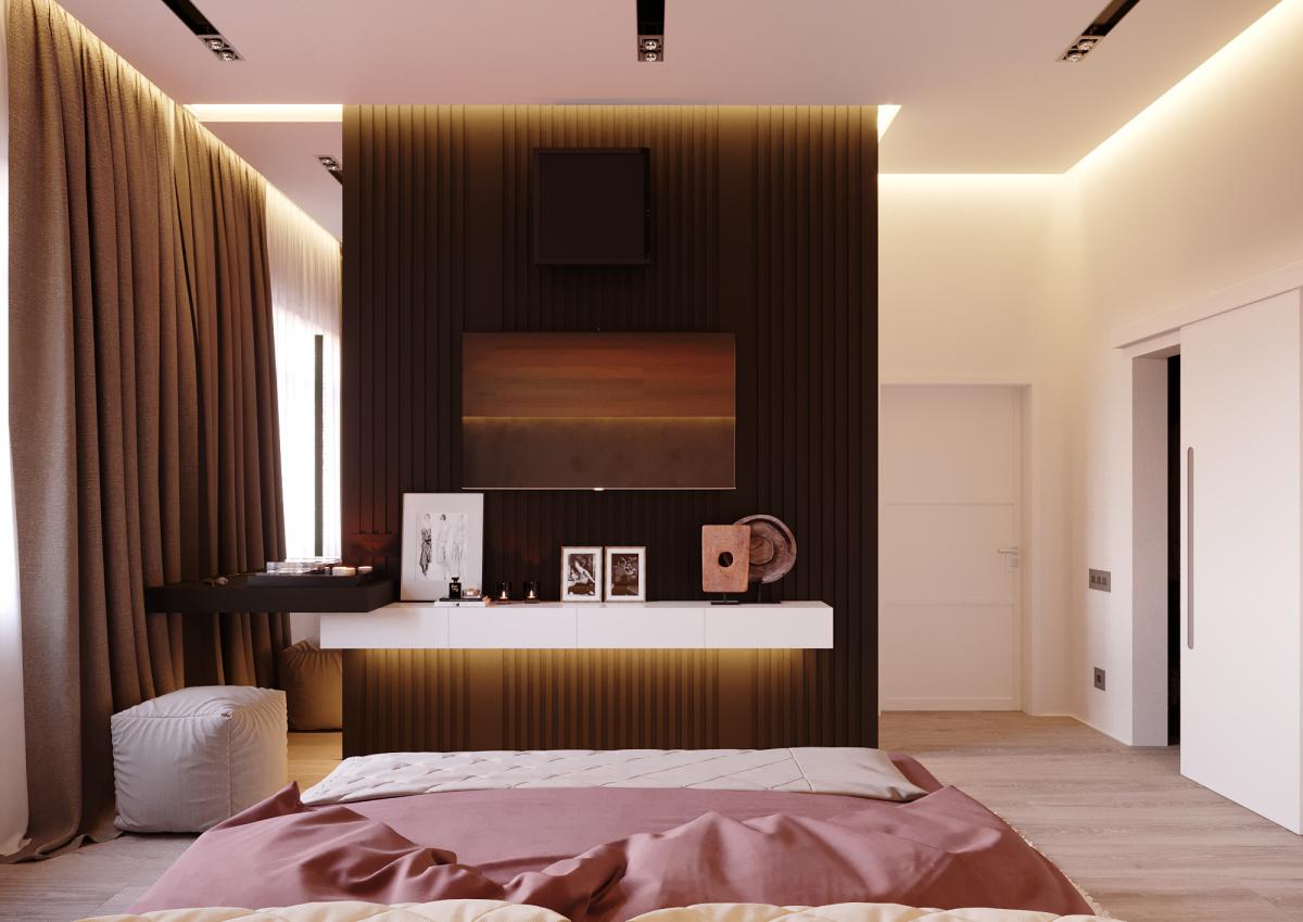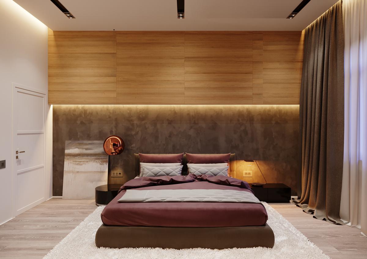 Several lighting scenarios and in the parent bedroom. With the help of highlights, we selected the texture of the walls. Whether it is decorative plaster under concrete, panels of slats or just painting, under the influence of warm light, they take on a completely different look.