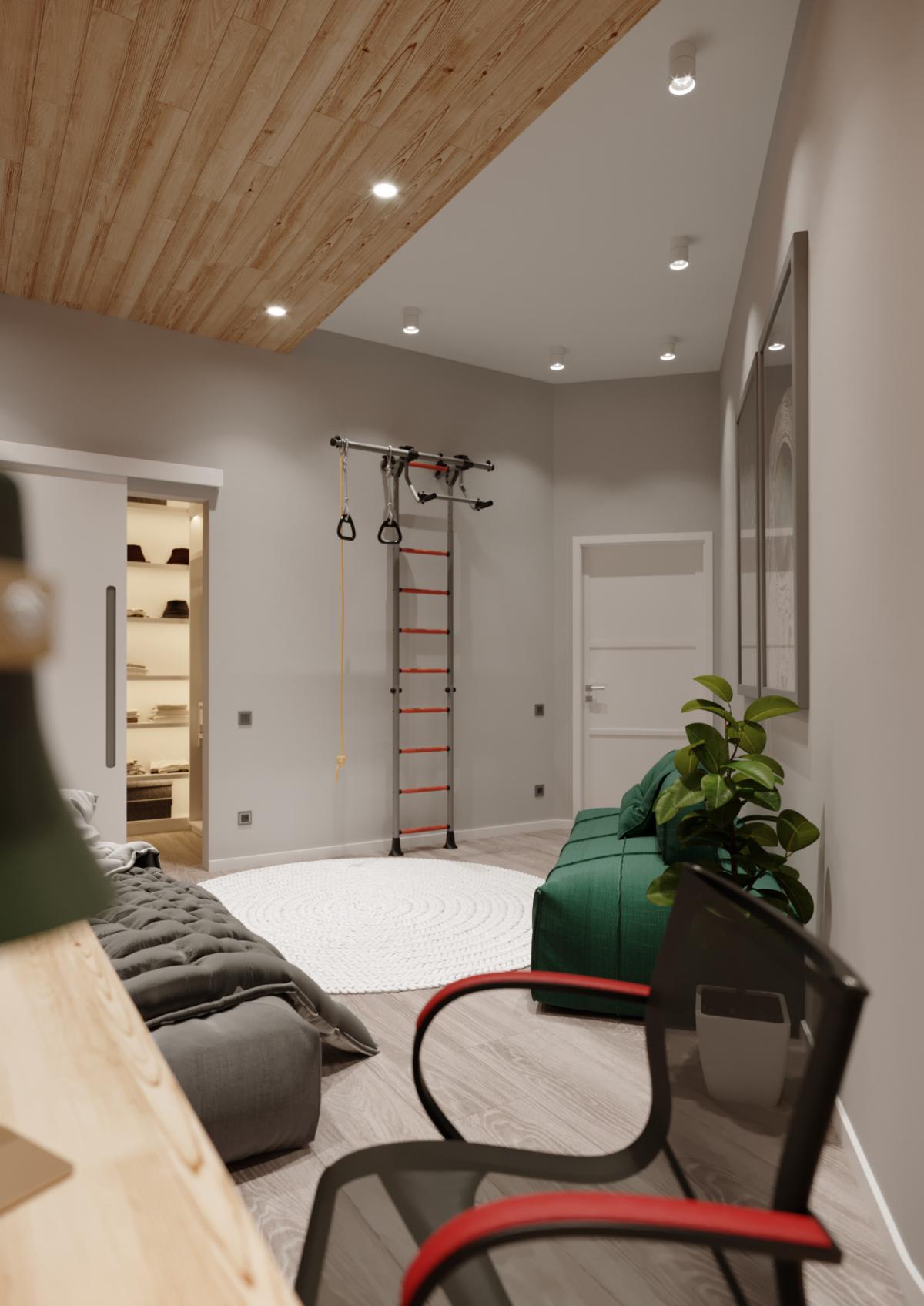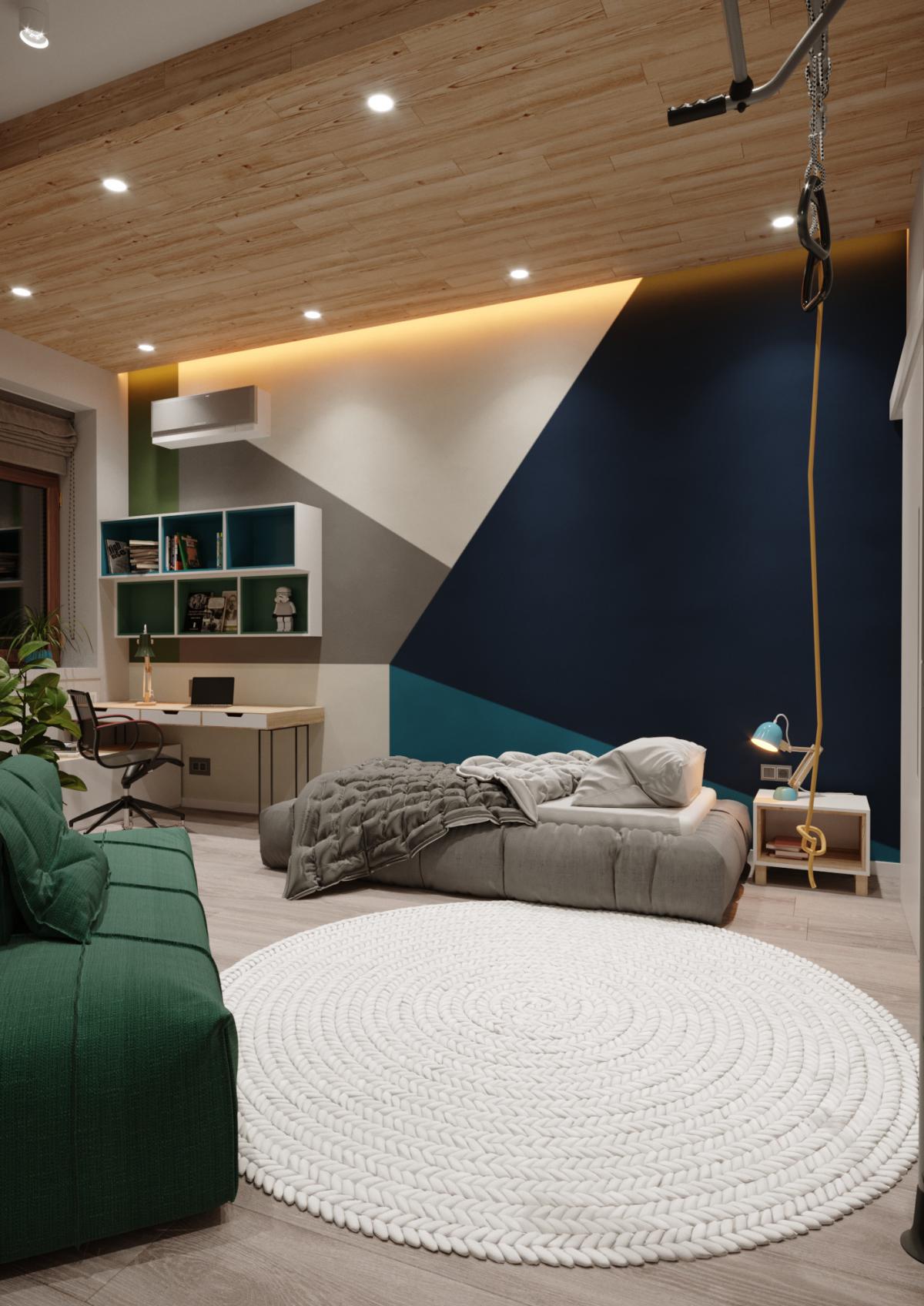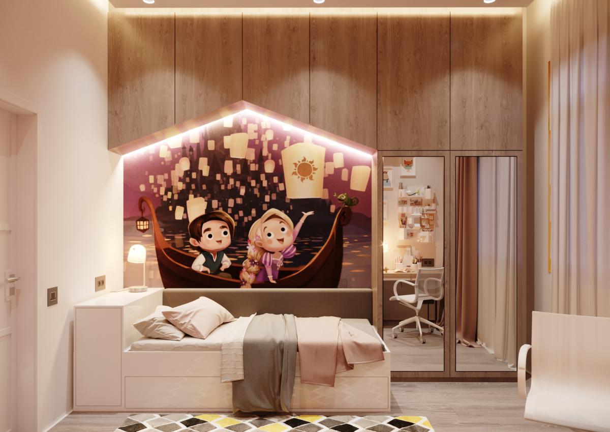 Minimalism and pastel colors in children we diluted with color. So, in the room for the girl on the wall, favorite cartoon characters go on a journey, and in the room for the boy, a bright rack harmoniously combines with a strict geometric composition on the wall. The furniture in the nursery also fits harmoniously into the interior, without glaring. At the same time, we tried to make it as functional and roomy as possible.