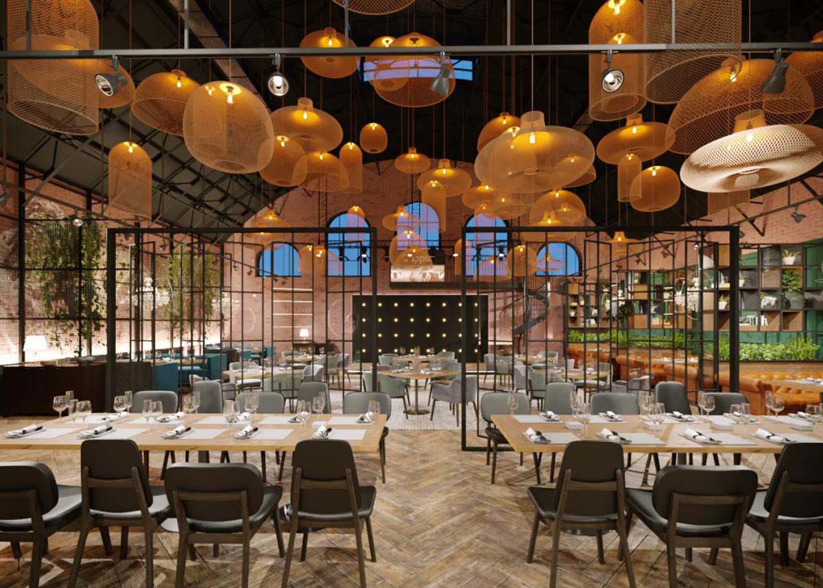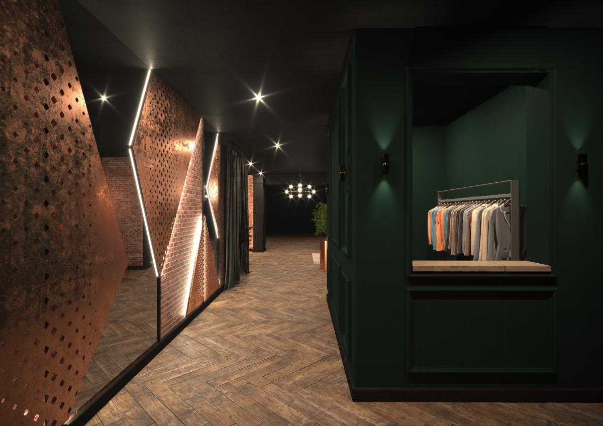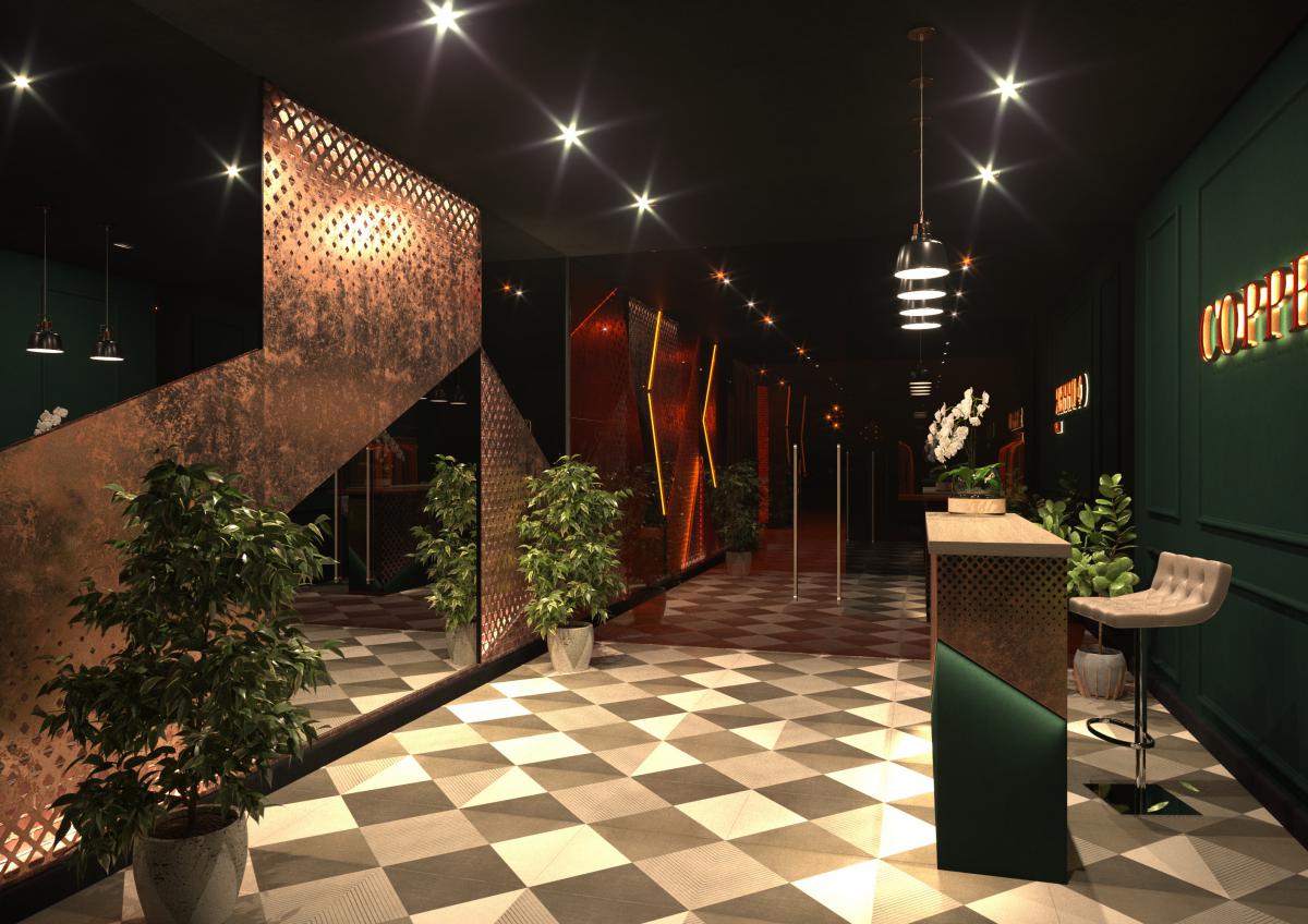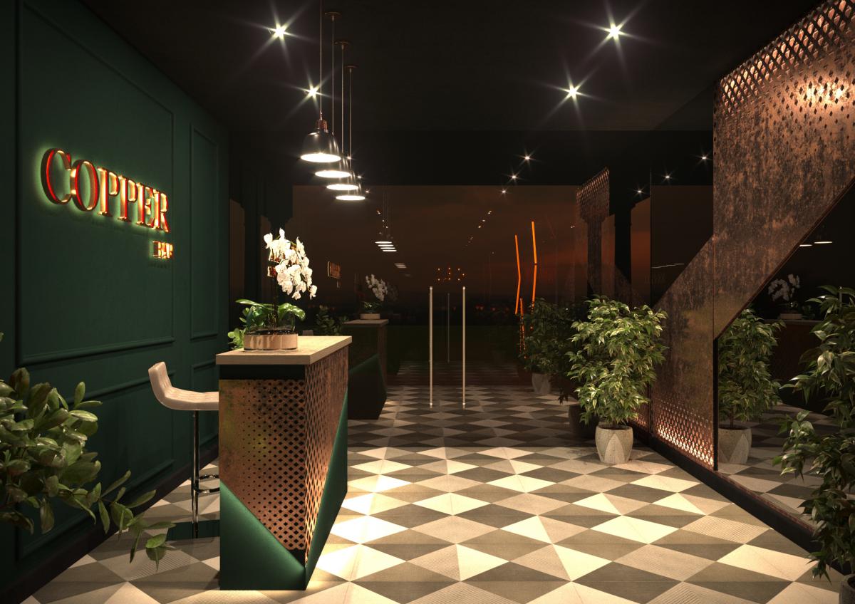 При входе в ресторан Вас встречает стена из глянцевых листов перфарированного металла медного цвета. Чтобы еще больше подчеркнуть красоту металла ,мы добавили подсветку ,засчет чего стена заиграла тенями и стала объемной.