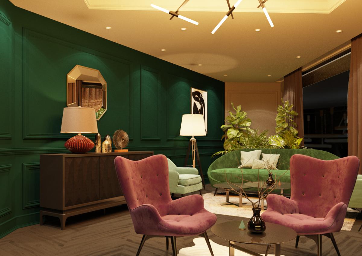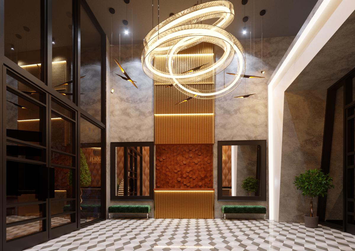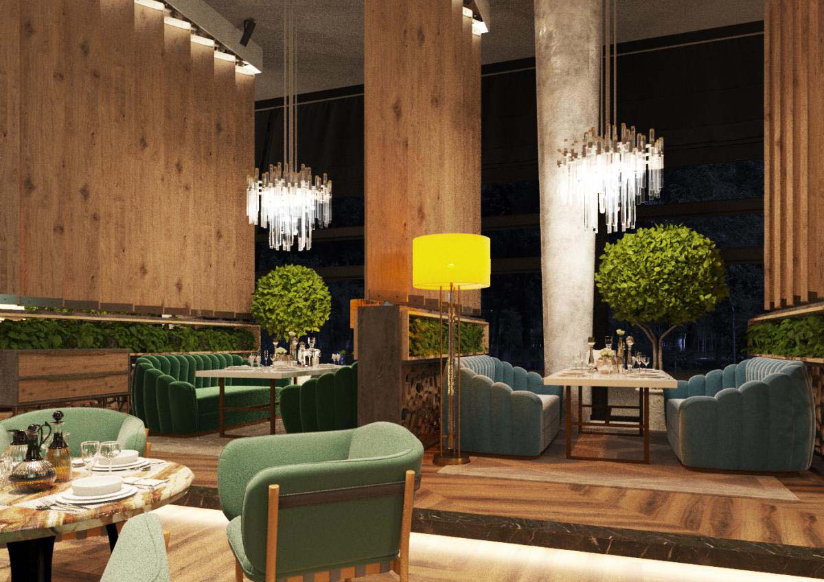Концепция заключалась в создании такого интерьера, который будет максимально прозрачным и приближен к живой природе. Первое, что необходимо было сделать - это распределить все зоны так, чтоб с каждой точки открывался новый вид. Второе- обыграть высоту потолков. Высокие потолки позволили нам использовать объемные люстры. В центре вестибюля люстра в виде колец и знаменитые светильники фирмы Delightfull Coltrane,подвешенные на разной высоте. Гардеробная выделена рейками, шпонированных под золотой дуб.