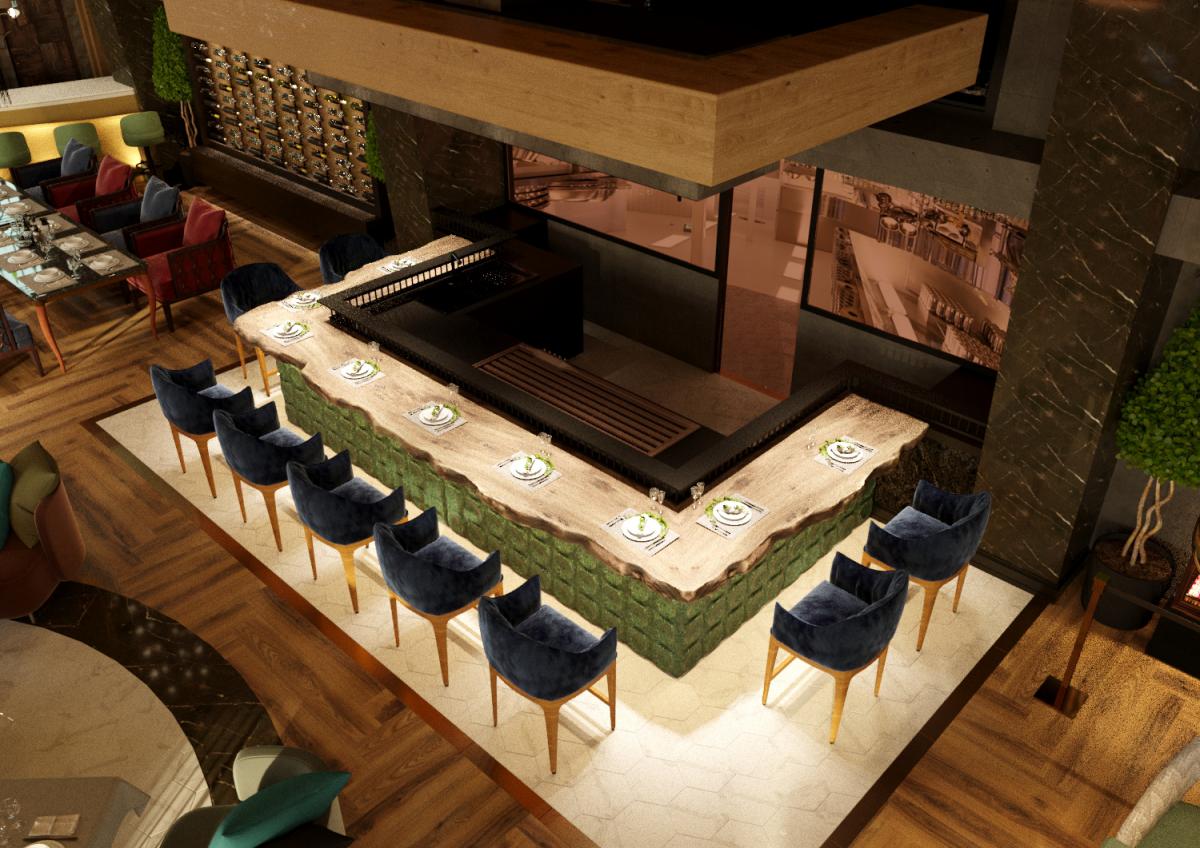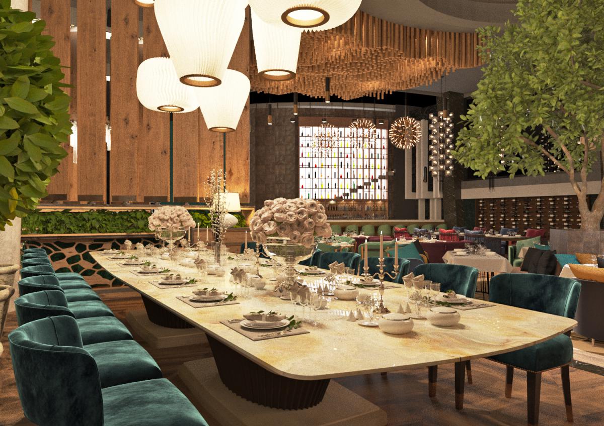 В центре зала ,как напоминание о саде, растет королевская магнолия. В зале можно увидеть даже аквариум с морской рыбой, которую в будущем повар приготовит специально для Вас. Еще одна гастрономическая изюминка-это открытая зона барбекю. Рядом расположен большой бар обтекаемой формы, столешница которого сделана из кореана. Вдоль окон посадка с удобными мягкими диванами, которые разделяют огромные ширмы-великаны из слэба. Ширмы имитируют стволы многолетних деревьев ,а живые растения в нише-листву этих деревьев. Расслабившись на комфортабельном диване и опрокинув голову вверх, посетители увидят на самом верху необычную инсталляцию . Инсталляция на потолке имитирует рассеянные круги солнца и сделана из брусков легкого пробкового материала . Тематику солнца продолжают итальянские подвесные светильники BLS из коллекции Raimond и светильники Copper Shade Toма Диксона.