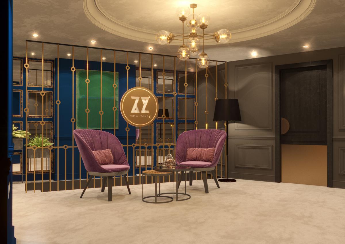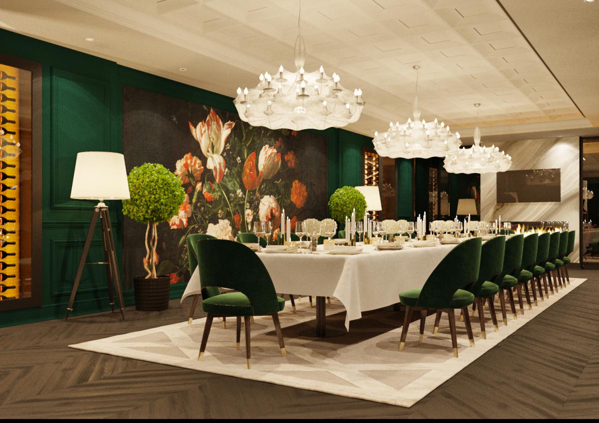 На втором этаже расположен VIP зал. Интерьер здесь более сдержанный. На первом этаже смешиваются модернизм, хай-тек, неоклассика, фьюжн, на втором основной стиль- неоклассика. Среди классического декора стен мы предложили сделать роспись в стиле голландского натюрморта, по бокам два винных холодильника. В центре зала большой стол .Тщательно подбирали освещение для VIPзоны и остановились на люстре Flos Zeppelin голландского дизайнера Marsel Wanders. В конце зала перегородка с мраморной отделкой и биокамином, который можно увидеть и с обратной стороны в зоне отдыха.