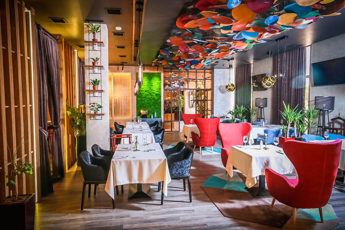 Условно ресторан разделен на 3 части: основной большой зал с высокими потолками и панорамными стеклами, ВИП зона на втором этаже и небольшой караоке зал. Мы хотели стереть границы экстерьера и интерьера, поэтому находясь в закрытом помещении и смотря в большие окна в пол, посетители могут наблюдать за природой. Элементы природы присутствуют и на глухих стенах. Так, вдоль лестницы можно увидеть большие листья папоротника и тропические цветы- это настенная живопись. Она стала центром композиции и объединяет сразу 2 этажа ресторана.