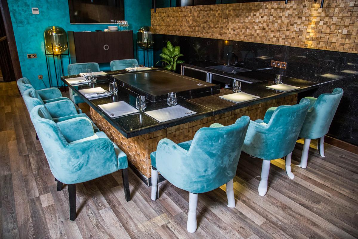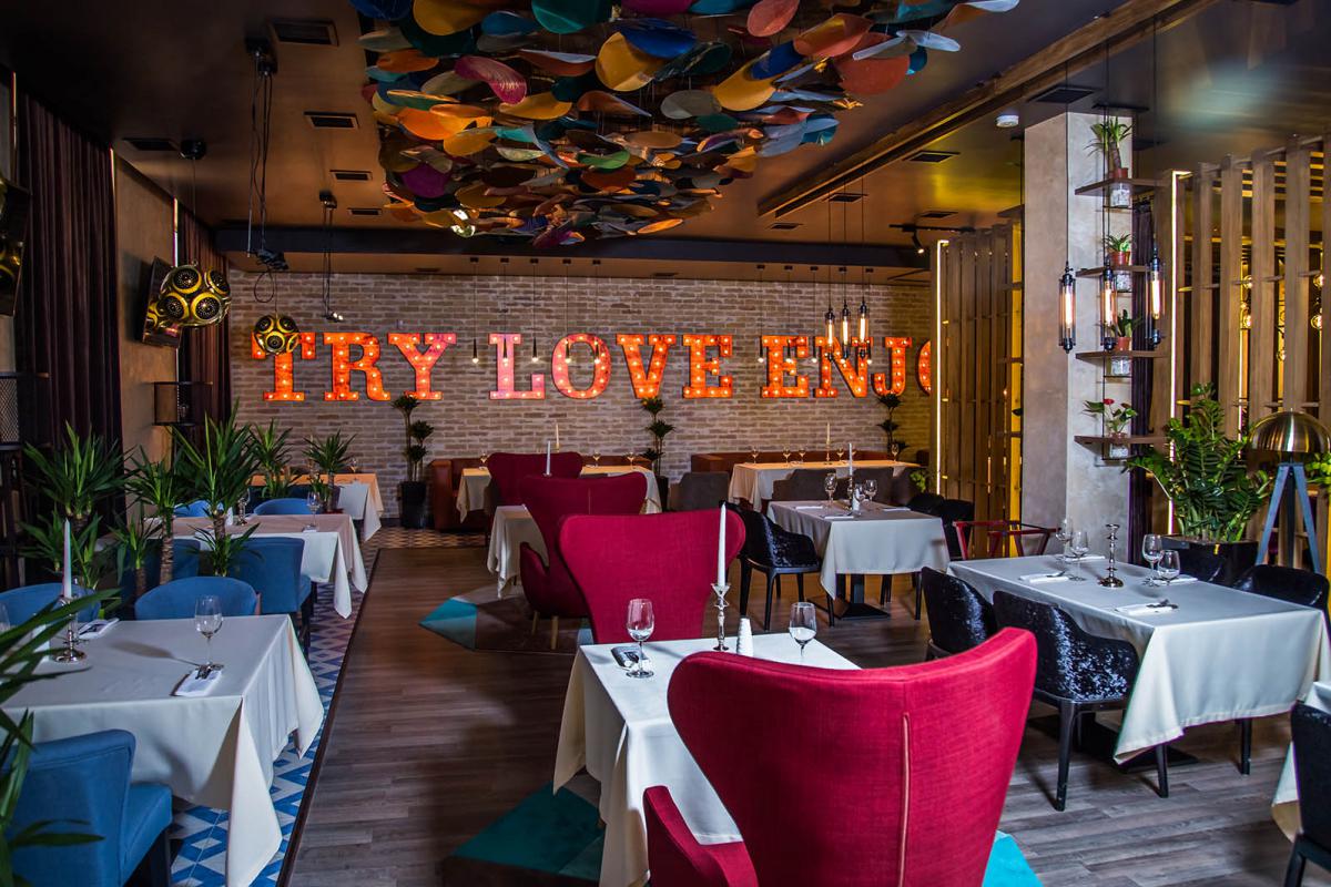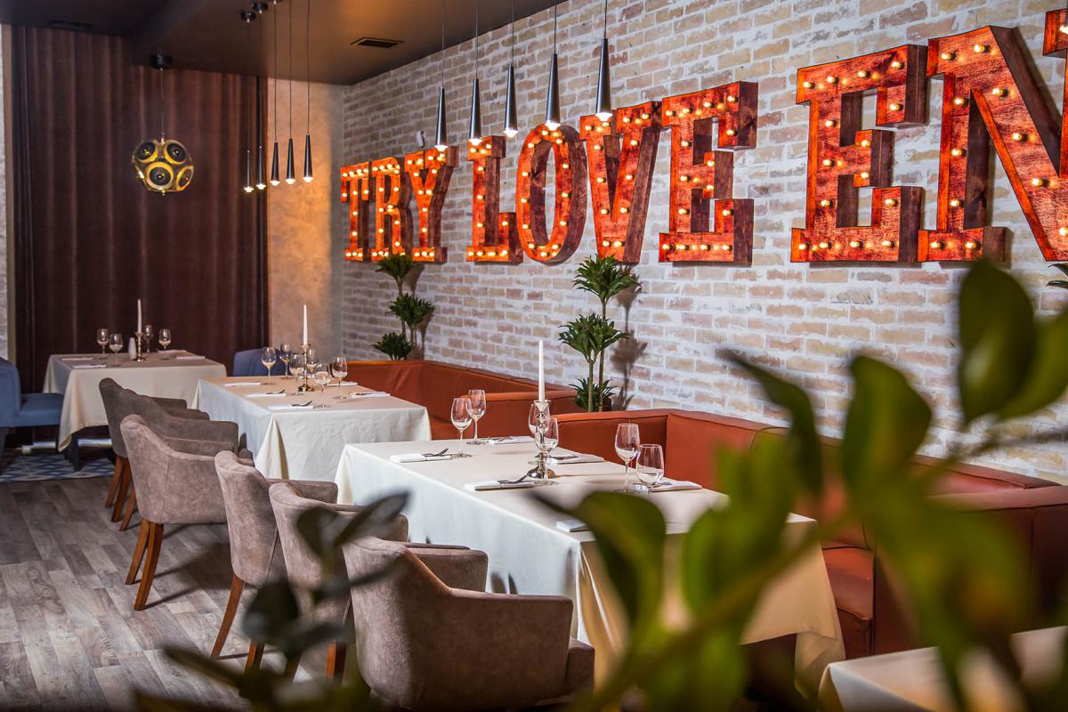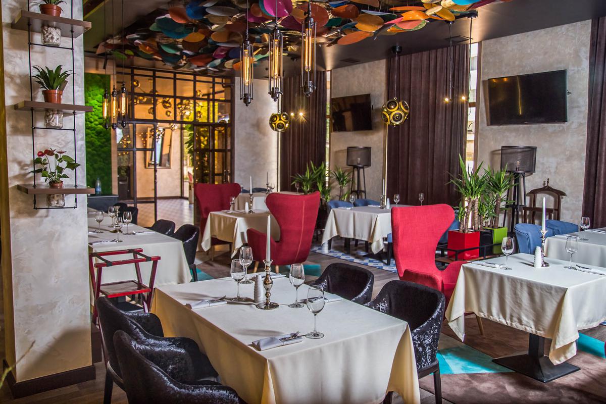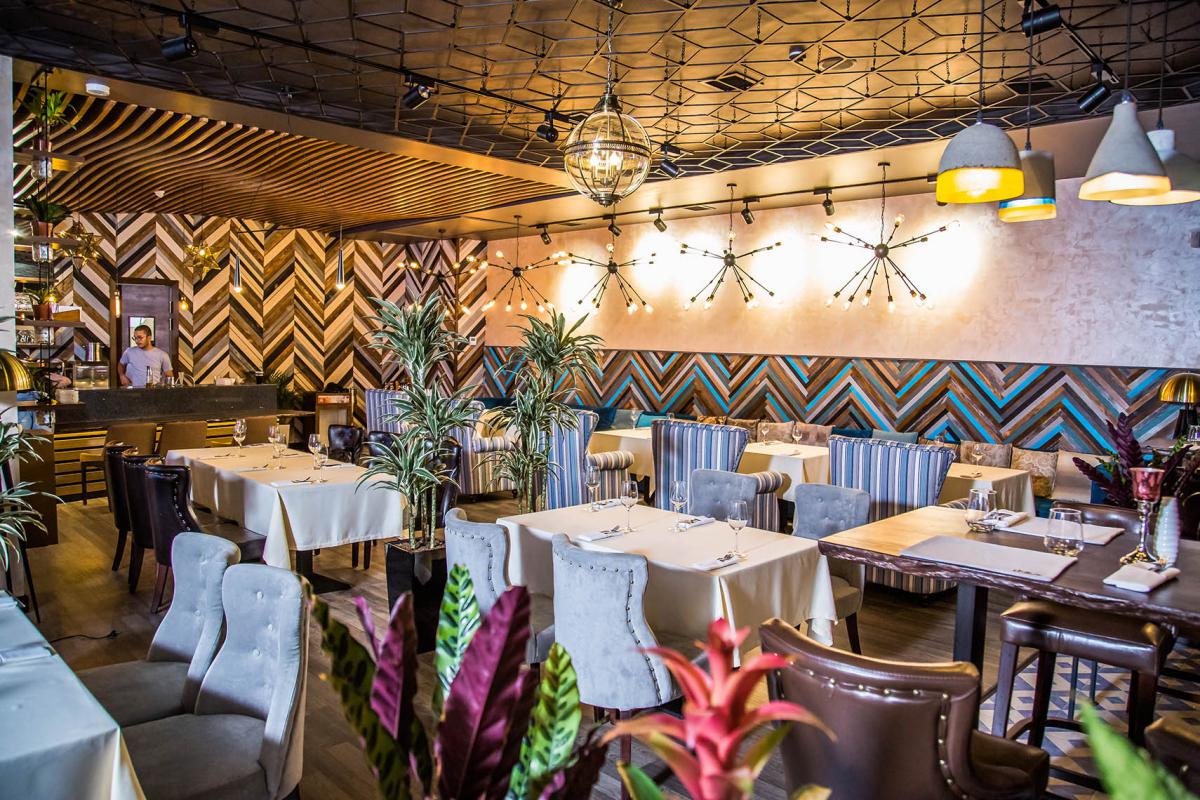 Основной стиль интерьера контемпорэри и ар-деко Нью Йорка начала 20 века , который характеризуется сочетанием противоположных элементов, блеском, строгой геометрией и глянцевымии матовыми поверхностями. В главном зале геометрия прослеживается почти на всех поверхностях от пола до потолка. Подчеркивают геометрию вставки из латуни, которые добавляют интерьеру шика. Трудно не заметить блеск, исходящий от инсталляции за сценой. Этот арт-объект наша студия разработала специально для этого ресторана. В изогнутой поверхности металла отражаются весь интерьер и роскошные массивные люстры. Их нельзя не заметить даже сидя на 2 этаже в ВИП зале.