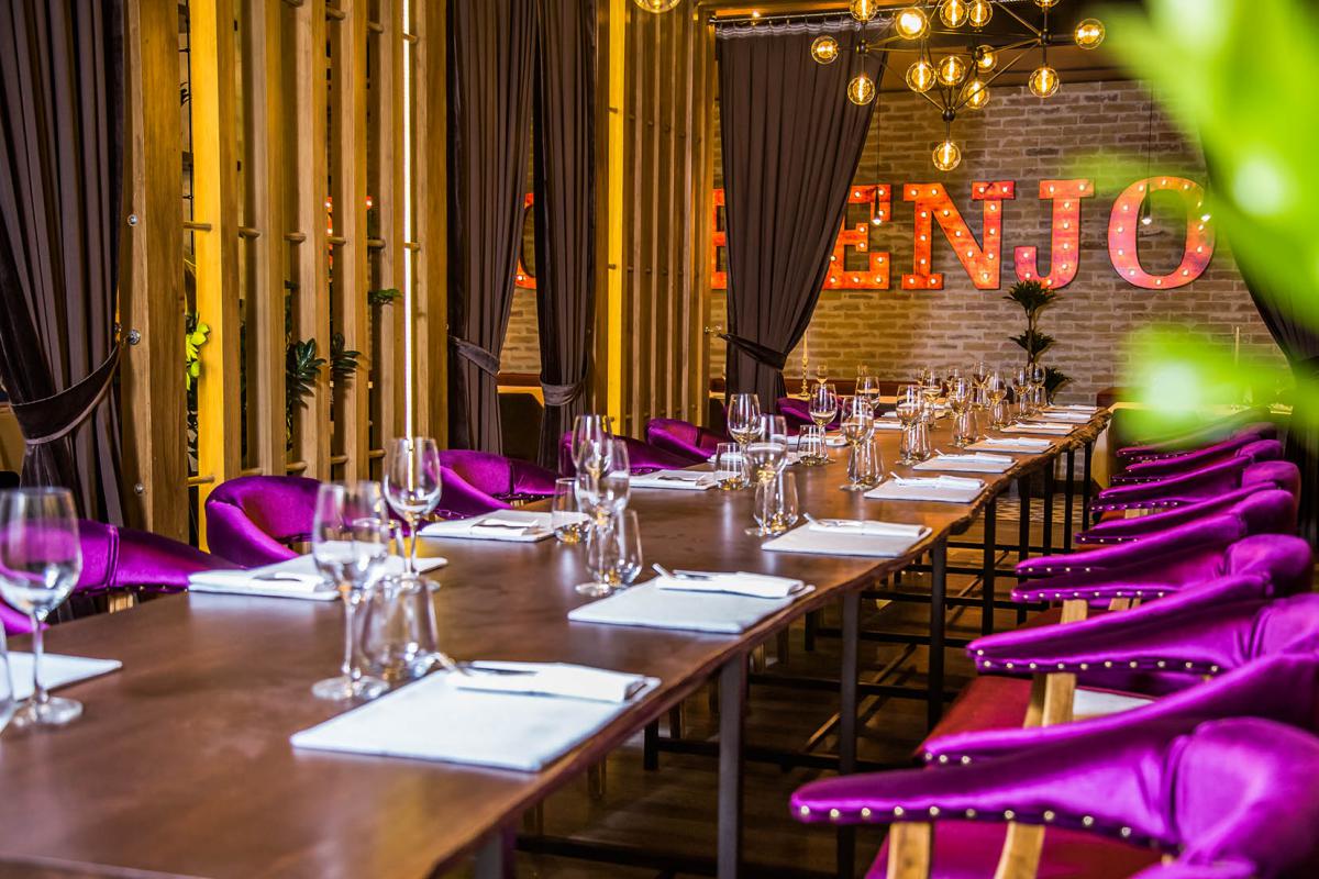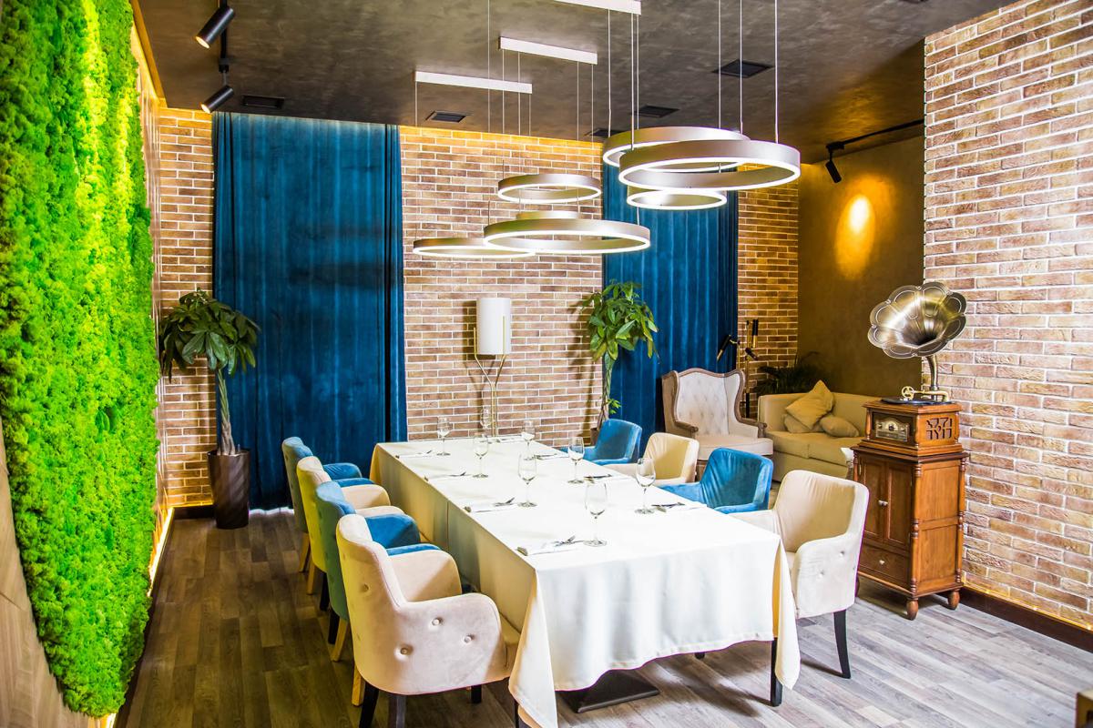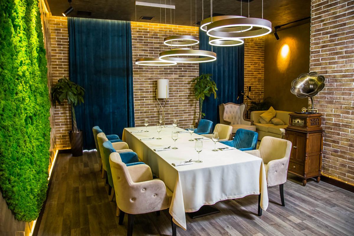 ВИП зал разделяет тот самый «аквариум» с зеленью. По одну сторону «аквариума» посадка для больших компаний за большим столом, который при необходимостиразделяется на несколько