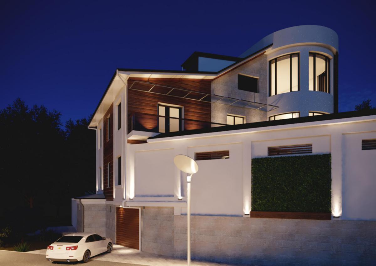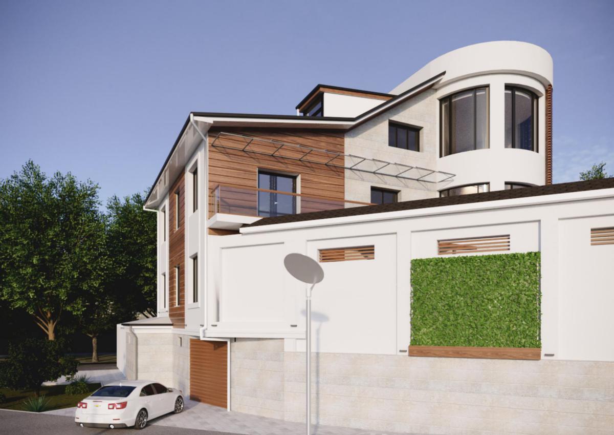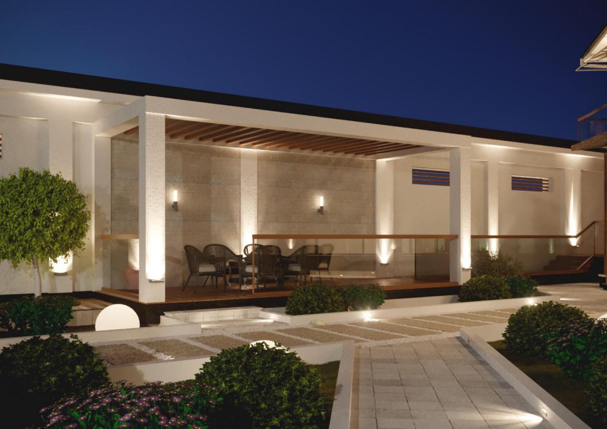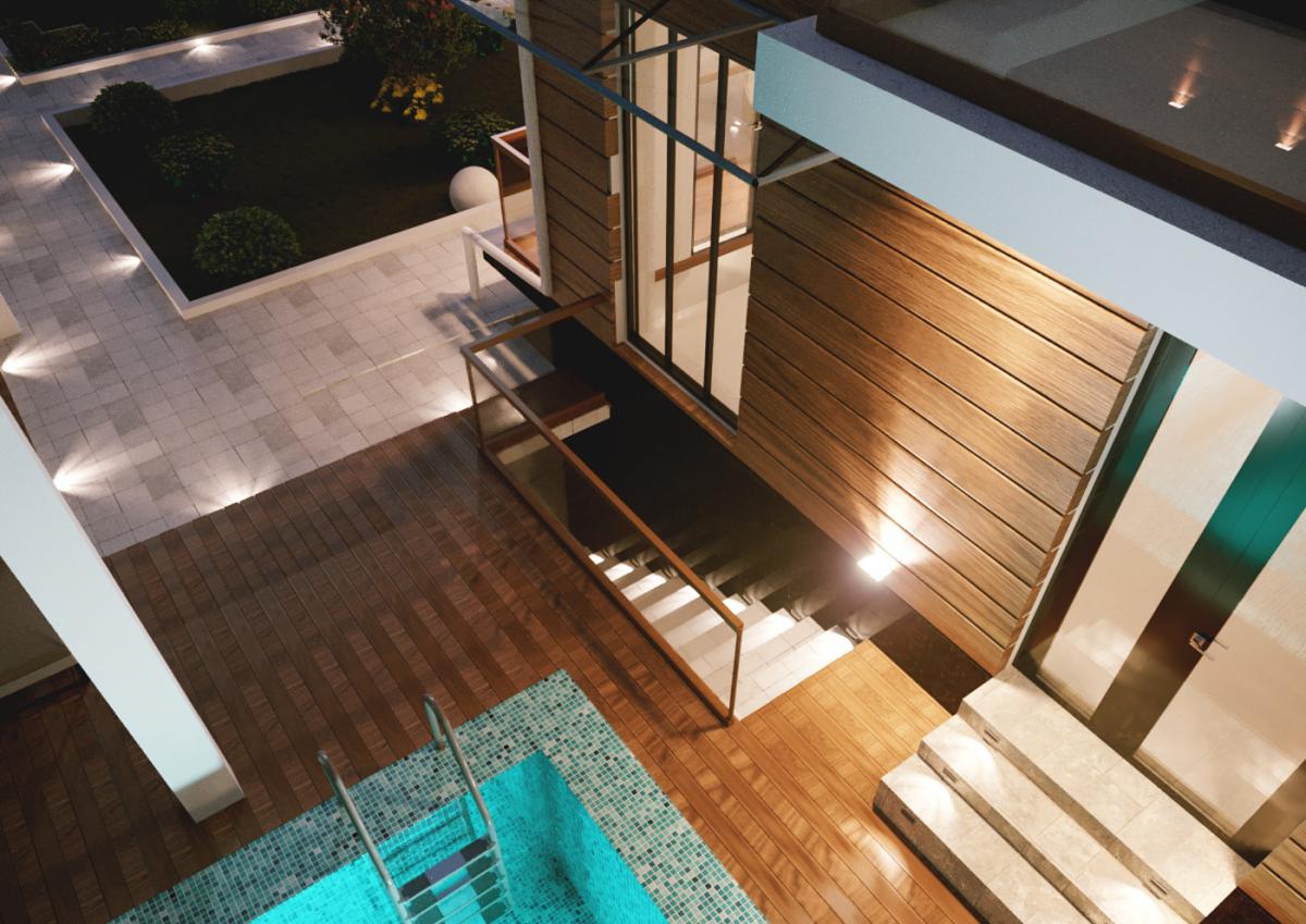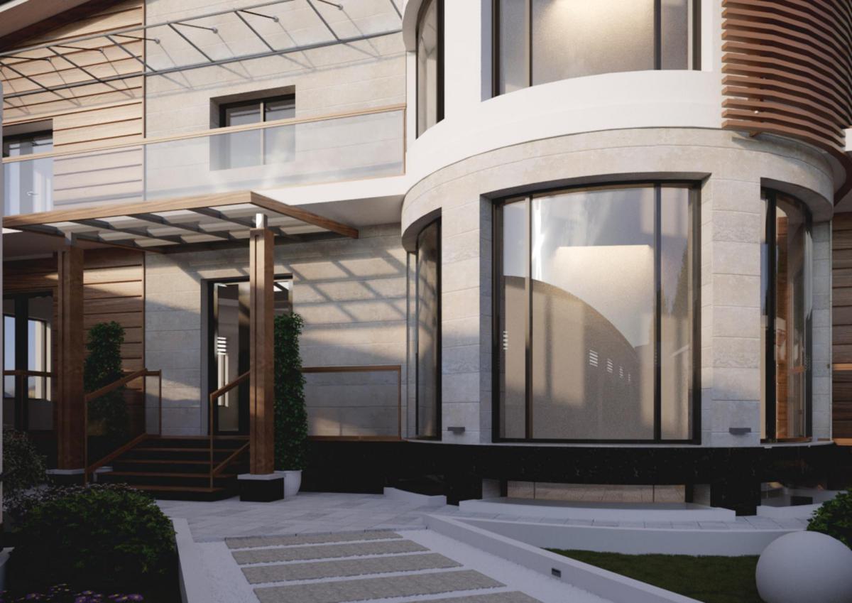 Для этого мы предложили использовать ДПК панели под дерево, обычную покраску белого цвета, травертин и гранит. За счет этих материалов мы заставили фасад заиграть полутонами и контрастами. Дополняют картину оконные рамы цвета антрацит и навесы из стекла, подвешенные на изящных металлических тросах. Очень детально и деликатно наша студия подошла к освещению фасада. Тщательно обдумывались форма светильников, их расположение, цвет лампы и как он будет светить.
