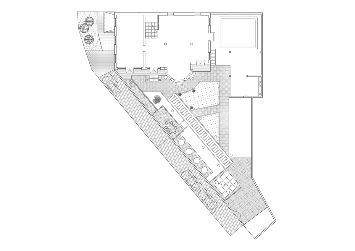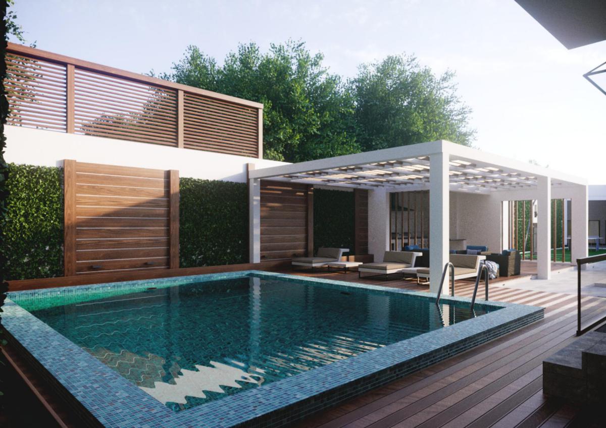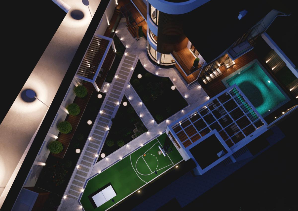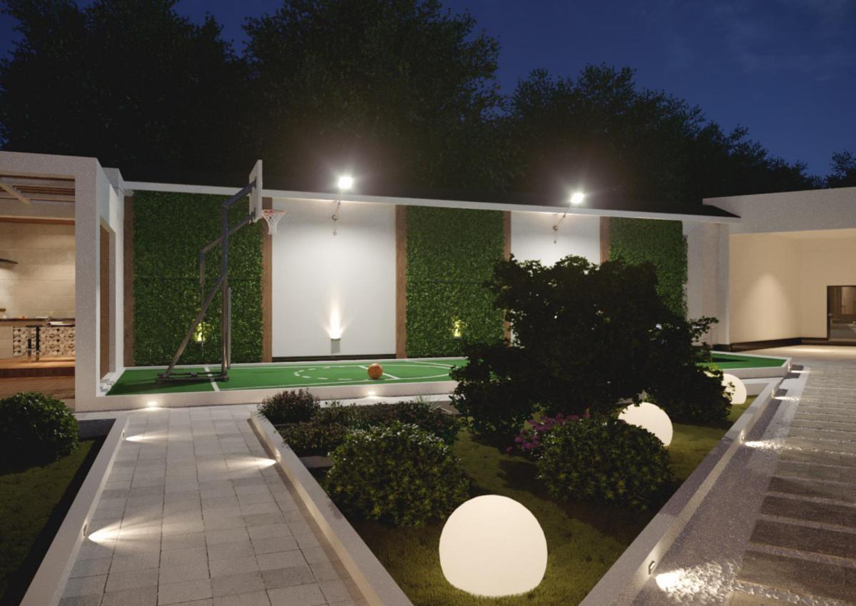 Отдельно разрабатывался и ландшафт участка. Для дорожек и бордюров мы использовали тот же травертин, что на фасаде. Участок получился многофункциональным, так как здесь разместились летняя кухня, бассейн ,спортивная площадка и зеленые участки для ландшафтных композиций.
