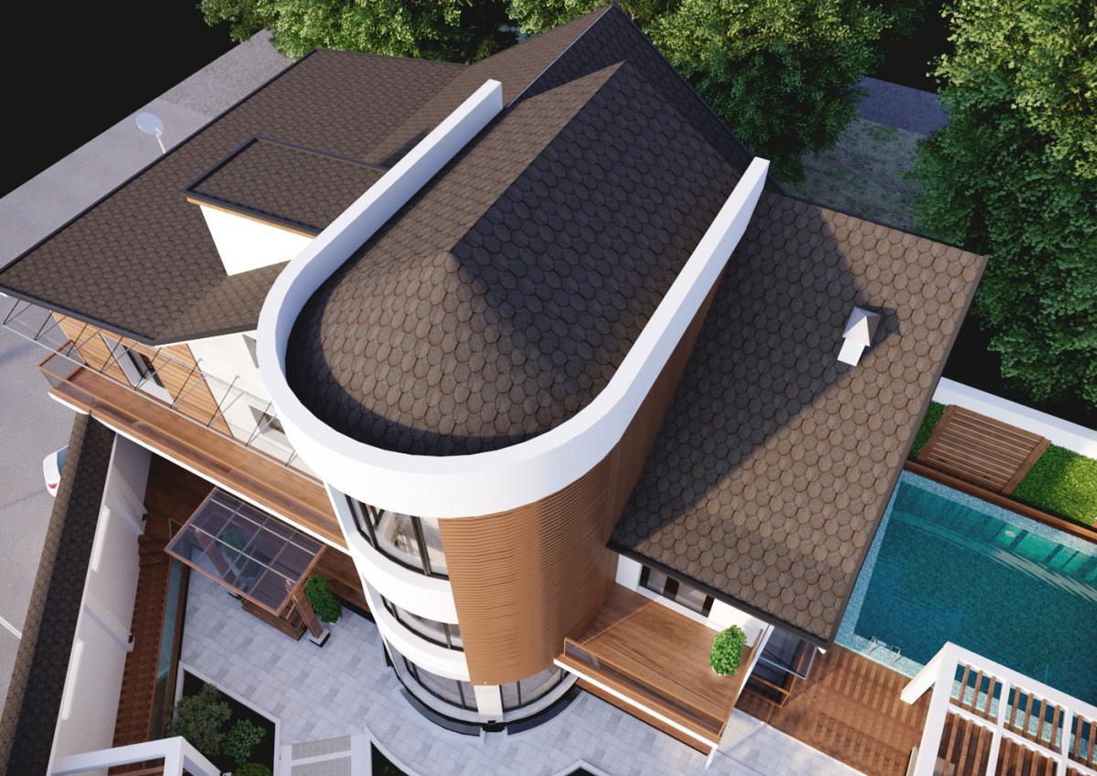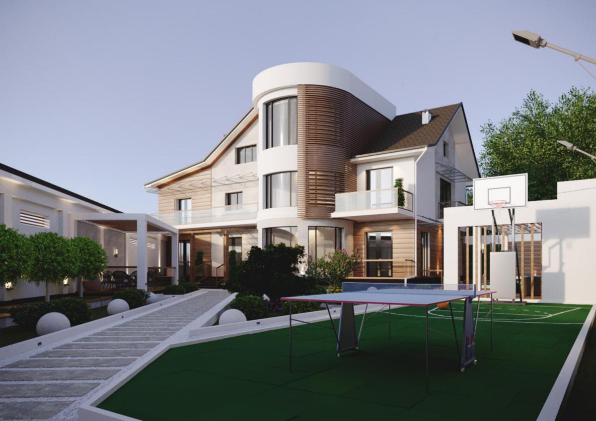 Перед нами стояла нелегкая задача. На участке уже был построен дом, который имел необычную конфигурацию. Хотелось создать современный фасад в стиле хай-тек, который дополнительно подчеркнул необычные формы.