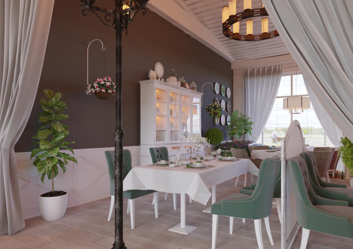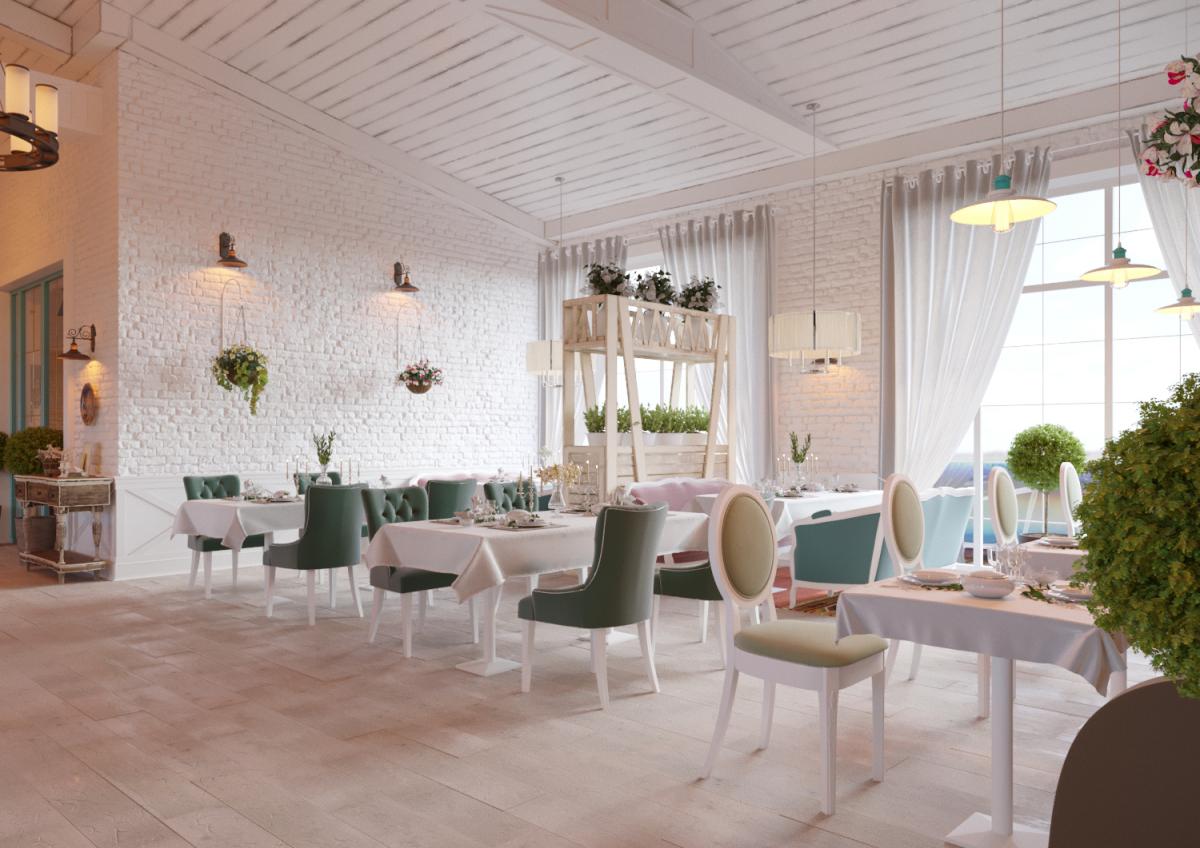 Мы создавали интерьер в стиле прованс. Прованс-это спокойная и умиротворенная обстановка без вычурных деталей. Поэтому мы стремились создать именно такую атмосферу уюта и тепла. Цвета в основном приглушенные светлые: белый, светло- желтый, бирюзовый, кремовый . Мебель и декор сделаны из искусственно состаренного дерева. Настроение задает и текстиль, которым обильно наполнен зал. Столы накрыты белоснежными скатертями, на диванах раскиданы пестрые подушки с мелким узором, воздушные тюли на окнах делают солнечный свет более мягким ,шторы из более плотной ткани выполняют функцию зонирования зала. В зале очень много зелени, как отдельно стоящие кашпо ,так и многоуровневые перегородки с цветочными композициями.