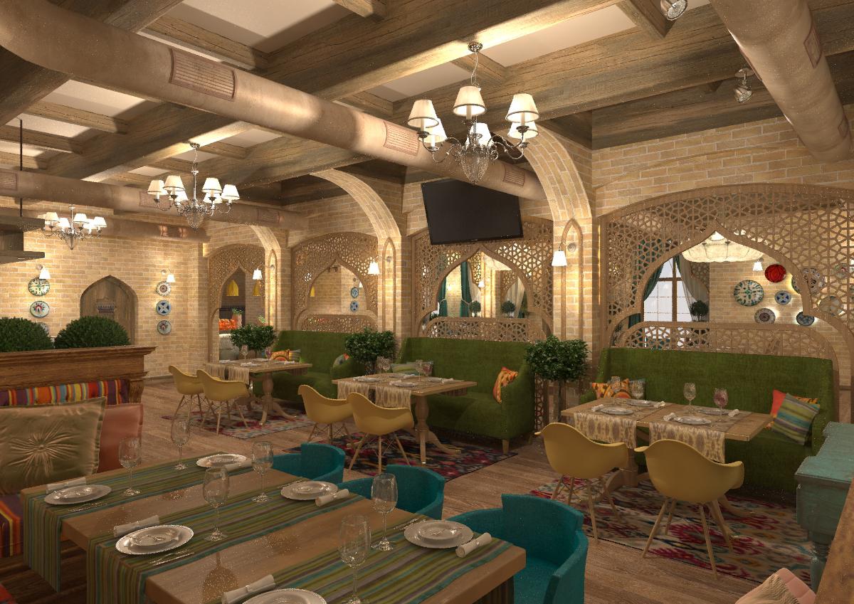 Главной изюминкой интерьера стал камин. Он выполнен по нашему эскизу и оформлен изготовленными вручную керамическими изразцами. Каждый предмет интерьера эксклюзивен и уникален. В зале много настенной росписи, на реализацию которой ушло почти три месяца.