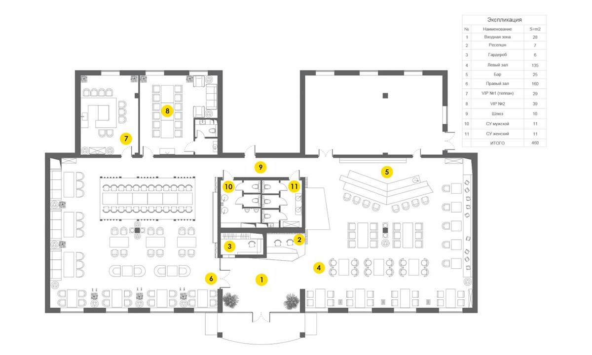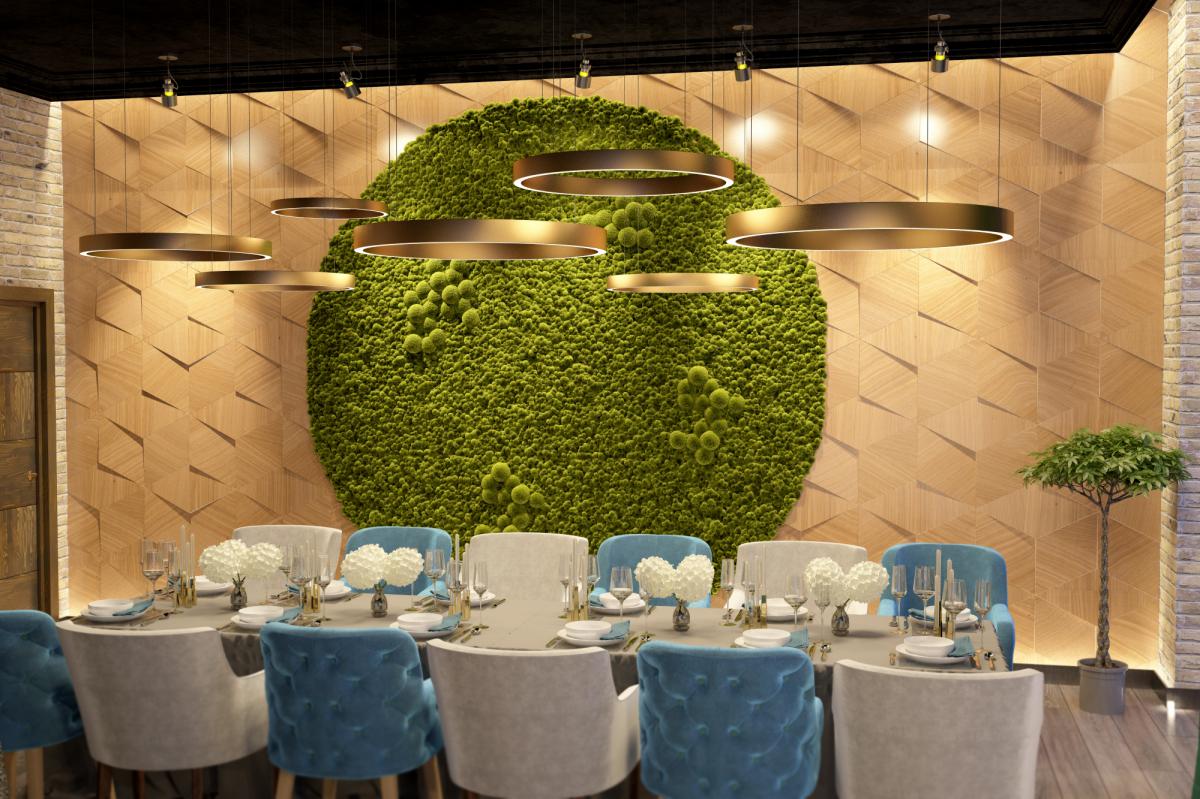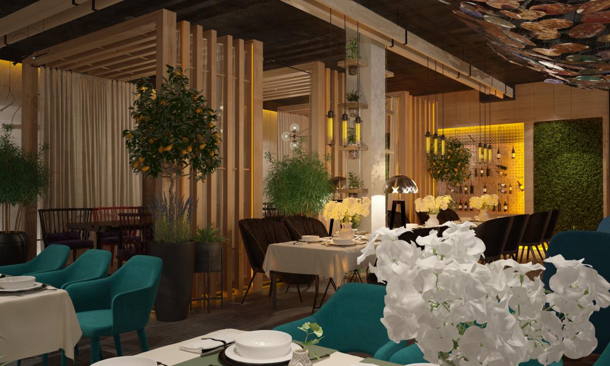 Интерьер тесно переплетается с экстерьером. В центре ресторана небольшой сад из существующих деревьев, которые бережно сохранили в течение всей стройки.