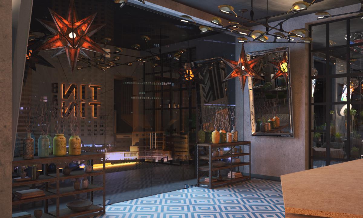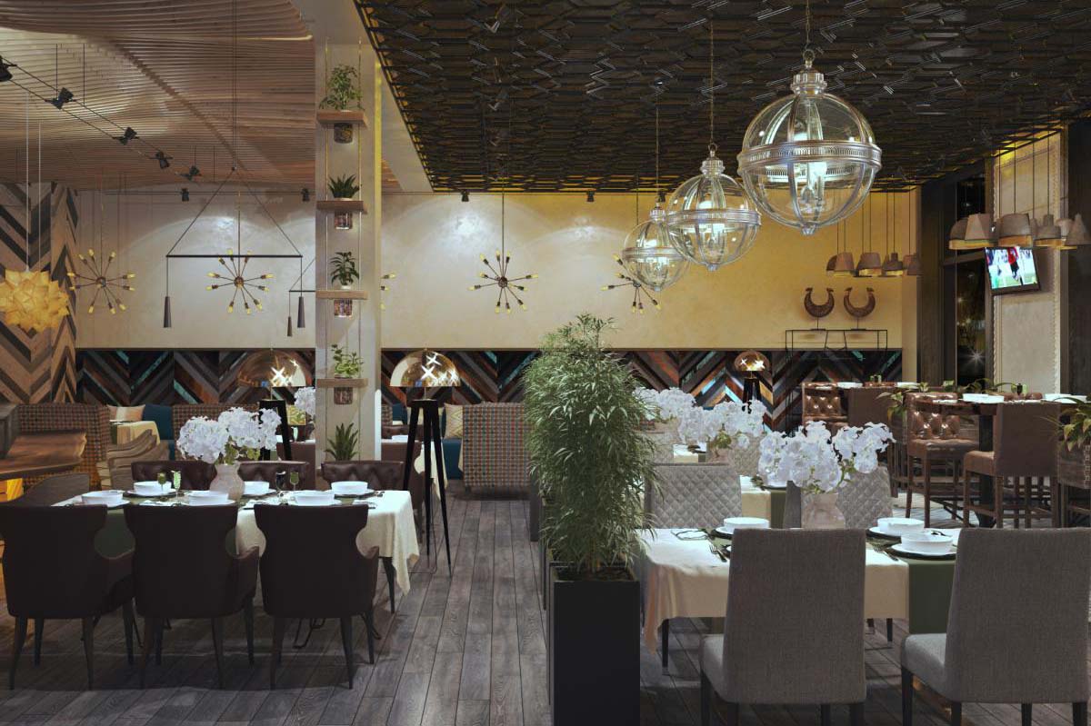 Основной стиль интерьера контемпорэри и ар-деко Нью Йорка начала 20 века , который характеризуется сочетанием противоположных элементов, блеском, строгой геометрией и глянцевымии матовыми поверхностями. В главном зале геометрия прослеживается почти на всех поверхностях от пола до потолка. Подчеркивают геометрию вставки из латуни, которые добавляют интерьеру шика. Трудно не заметить блеск, исходящий от инсталляции за сценой. Этот арт-объект наша студия разработала специально для этого ресторана. В изогнутой поверхности металла отражаются весь интерьер и роскошные массивные люстры. Их нельзя не заметить даже сидя на 2 этаже в ВИП зале.
