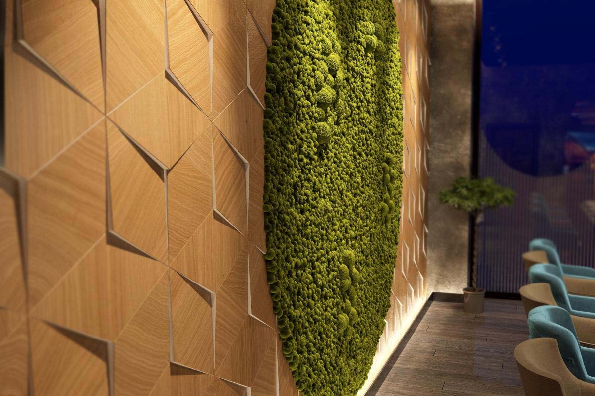 Условно ресторан разделен на 3 части: основной большой зал с высокими потолками и панорамными стеклами, ВИП зона на втором этаже и небольшой караоке зал. Мы хотели стереть границы экстерьера и интерьера, поэтому находясь в закрытом помещении и смотря в большие окна в пол, посетители могут наблюдать за природой. Элементы природы присутствуют и на глухих стенах. Так, вдоль лестницы можно увидеть большие листья папоротника и тропические цветы- это настенная живопись. Она стала центром композиции и объединяет сразу 2 этажа ресторана.