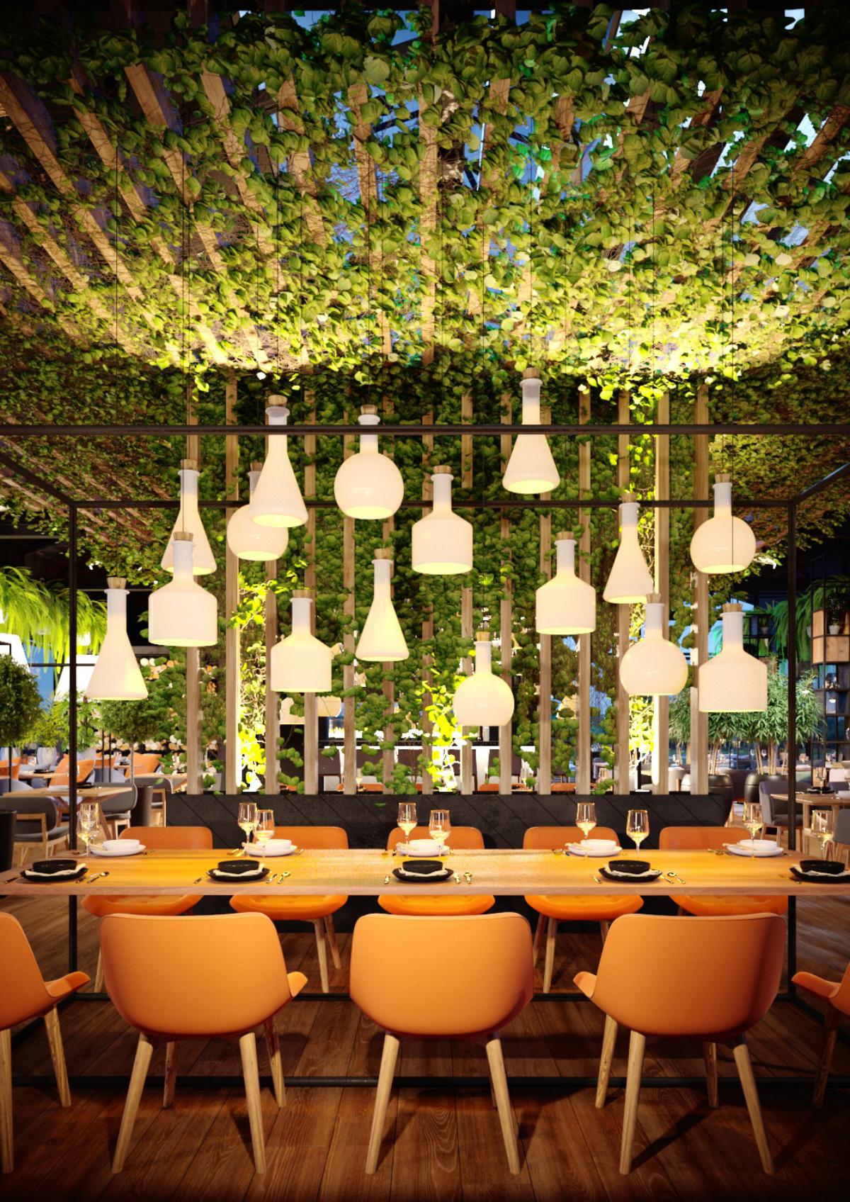 В центре зала подвесная конструкция из древесины ясеня, по которому вьется лиана. Получилась своеобразная беседка в интерьере. Для беседки мы подобрали светильники шутливого дизайна Labware,напоминающие химические пробирки и колбы ,используемые для научных экспериментов.