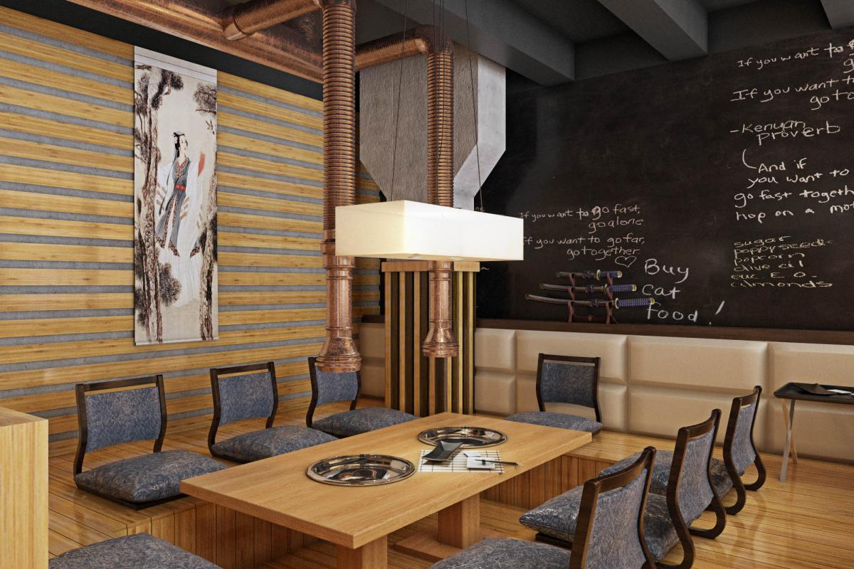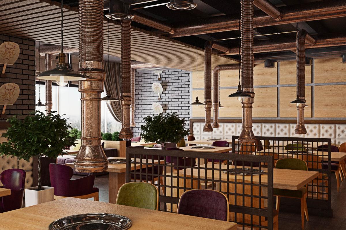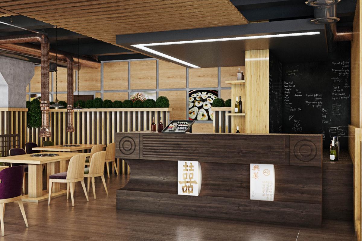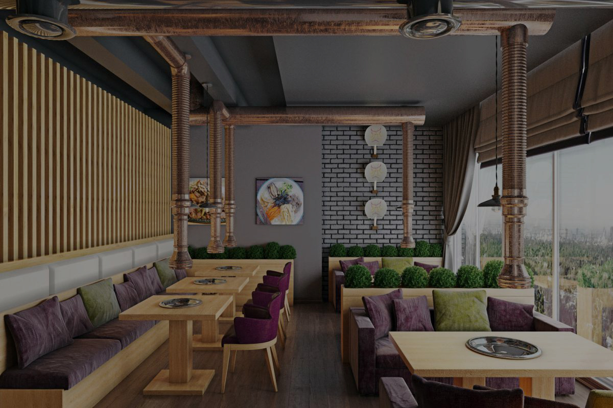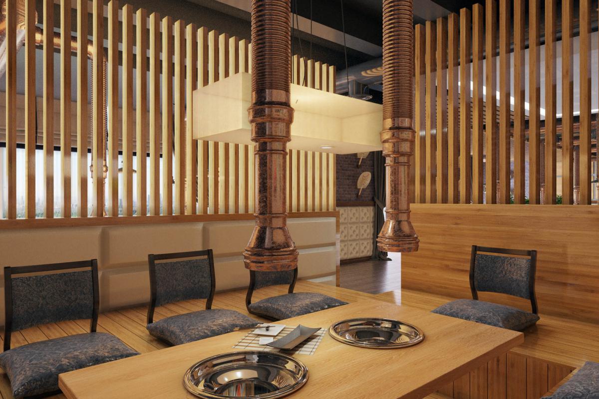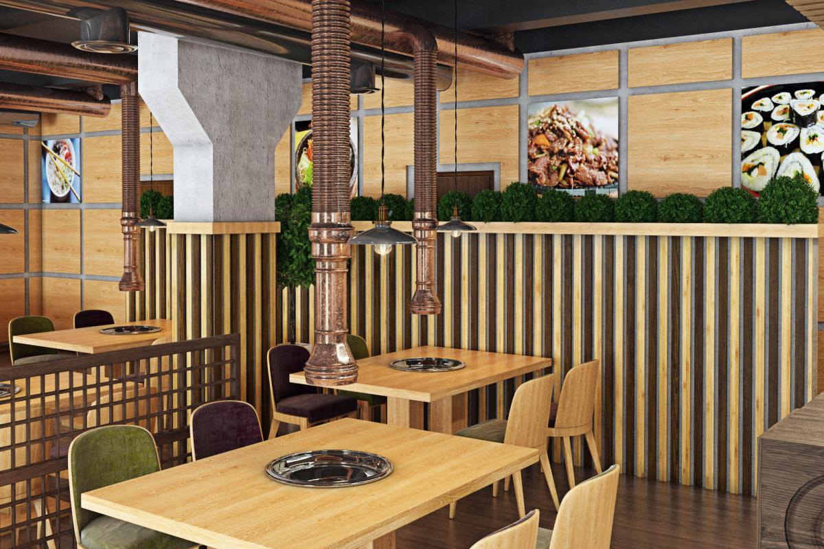 Traditional for South Korean cuisine is cooking at the table at the guests, so we provided hoods over each table. Another feature of the Korean style in the interior is low furniture. A wooden podium with Kuduri pillows was placed in the VIP room. A special feature of Kuduri is that warm air flows under the table, which warms the legs of the seated person. On the walls is a picturesque oriental panel with a plant theme.