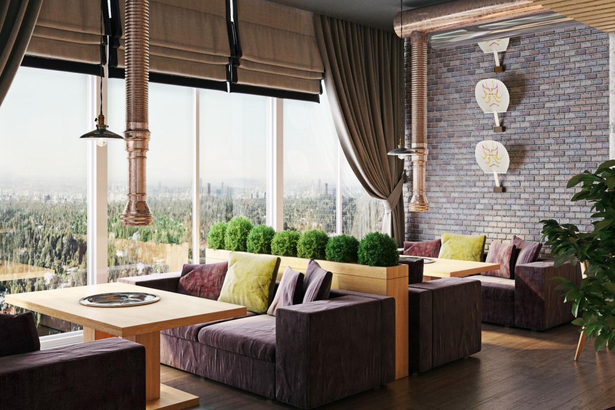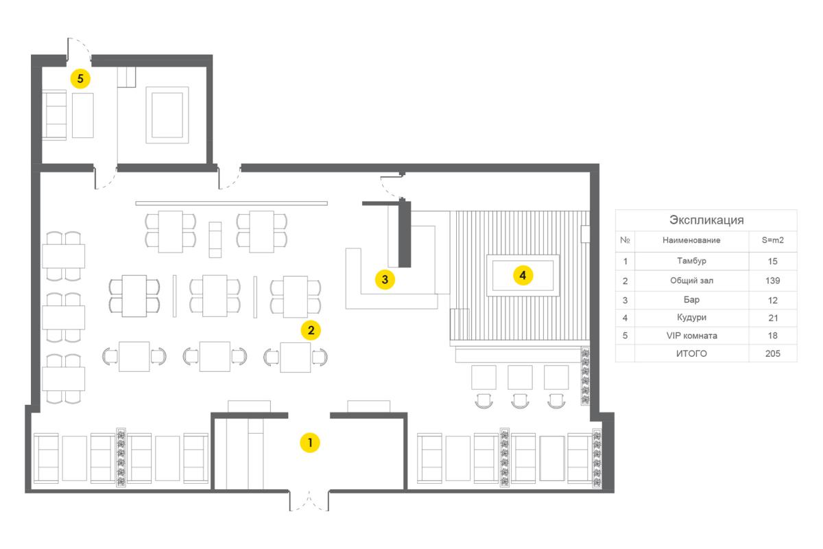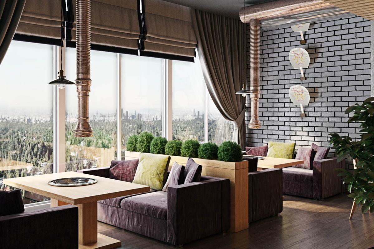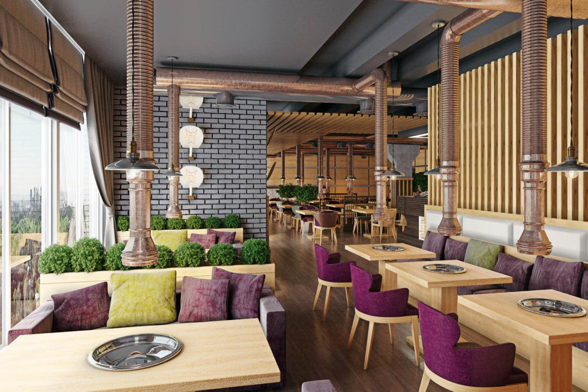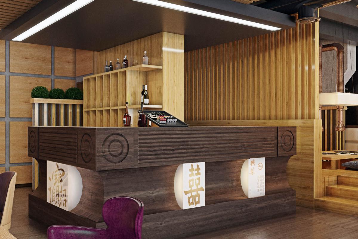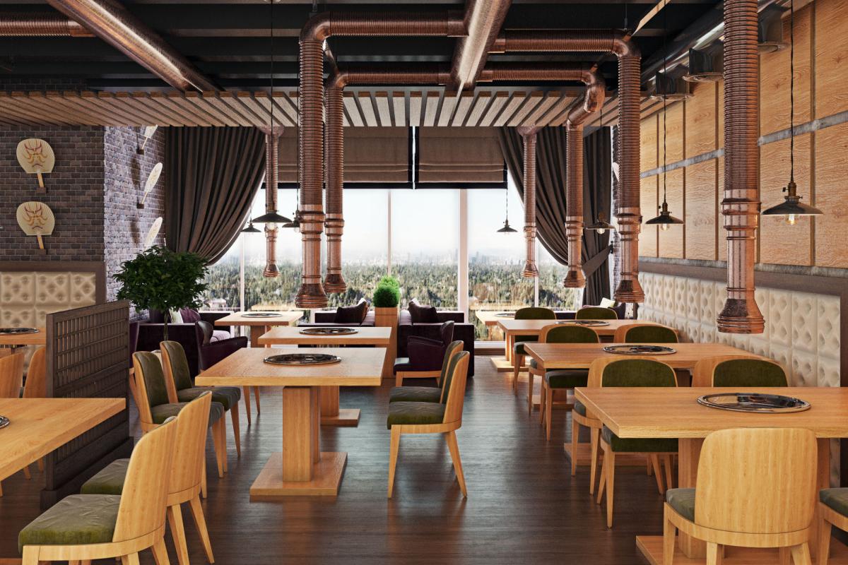 Traditional for South Korean cuisine is cooking at the table at the guests, so we provided hoods over each table. Another feature of the Korean style in the interior is low furniture. A wooden podium with Kuduri pillows was placed in the VIP room. A special feature of Kuduri is that warm air flows under the table, which warms the legs of the seated person. On the walls is a picturesque oriental panel with a plant theme.