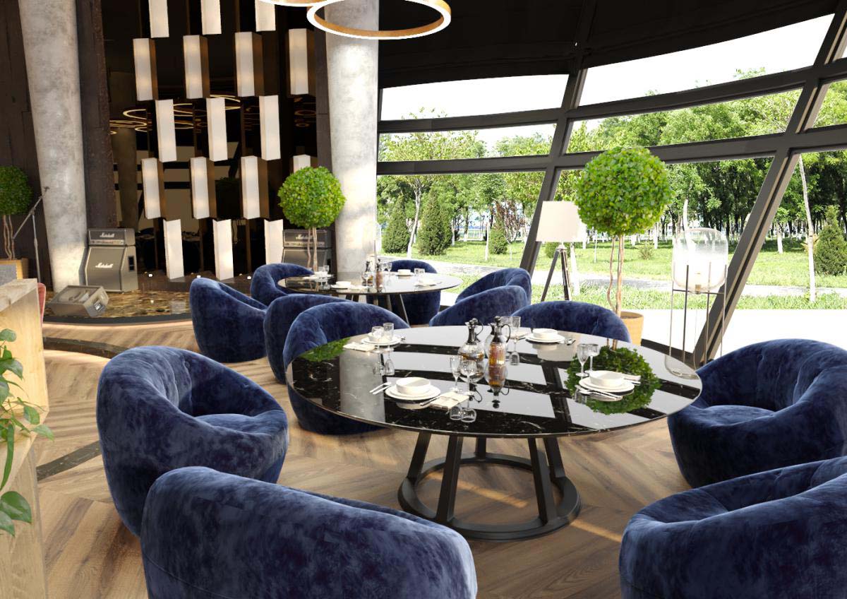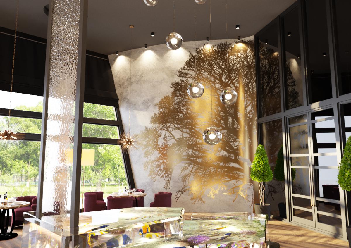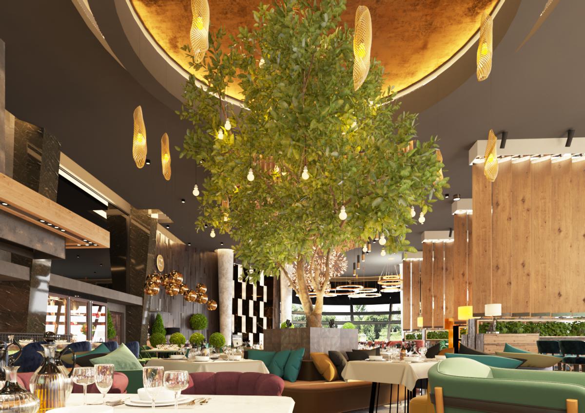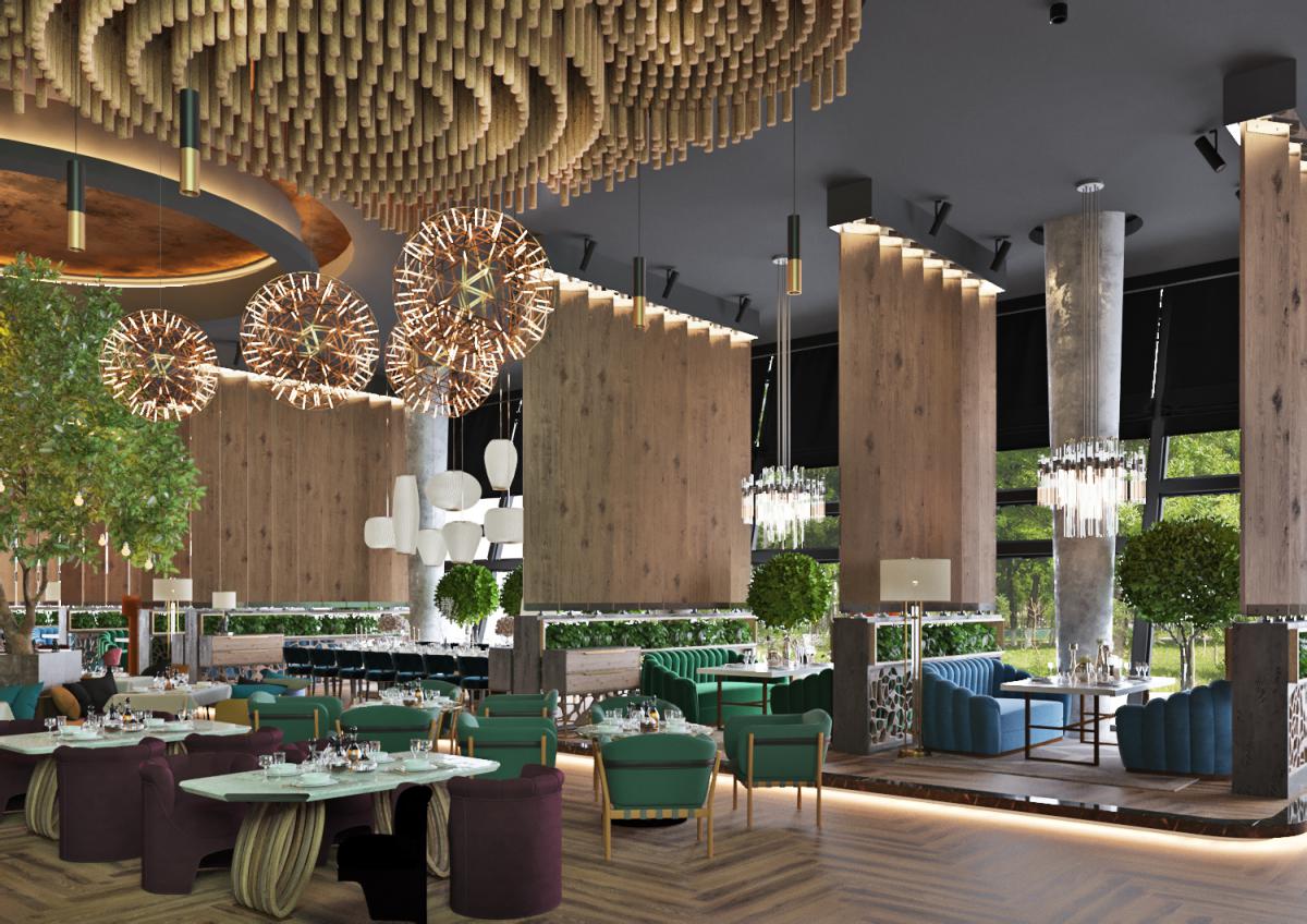 In the center of the room, as a reminder of the garden, grows a royal magnolia. In the hall you can even see an aquarium with sea fish, which in the future the chef will cook especially for you. Another gastronomic highlight is the outdoor barbecue area. Nearby is a large streamlined bar with a tabletop made from Korean. Along the windows there is a landing with comfortable soft sofas that are shared by huge giant slab screens. Screens mimic the trunks of perennial trees, and living plants in the niche of these trees. Relaxing on a comfortable sofa and tilting your head up, visitors will see an unusual installation at the very top. The installation on the ceiling imitates scattered circles of the sun and is made of lightweight cork bars. The sun theme is continued by the Italian pendant lamps BLS from the Raimond collection and Copper Shade by Tom Dixon lamps.