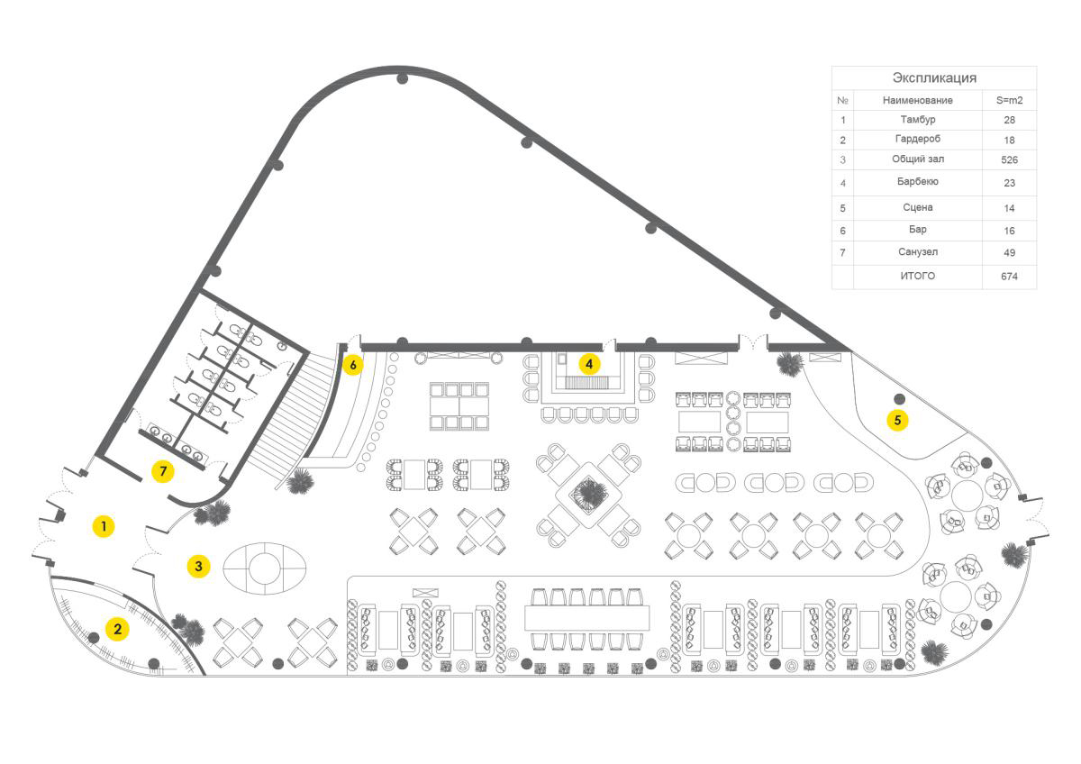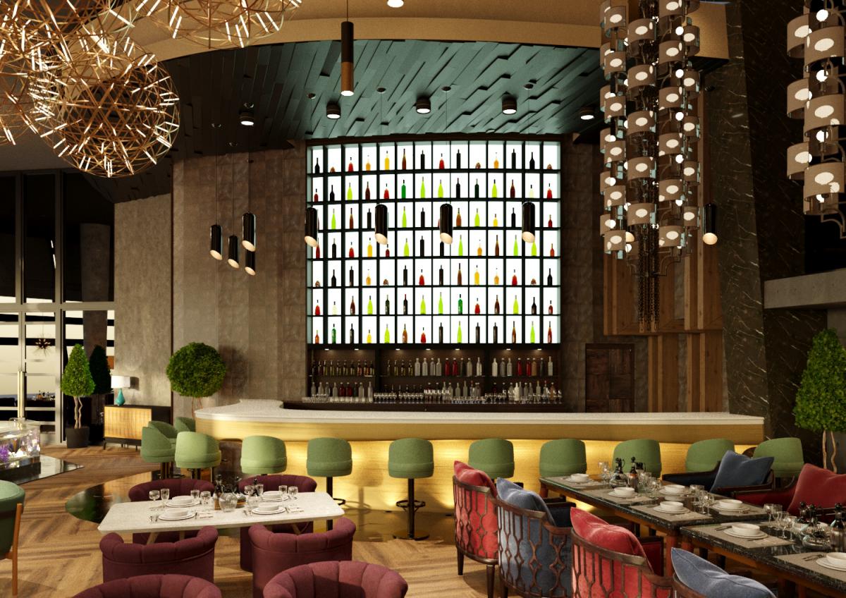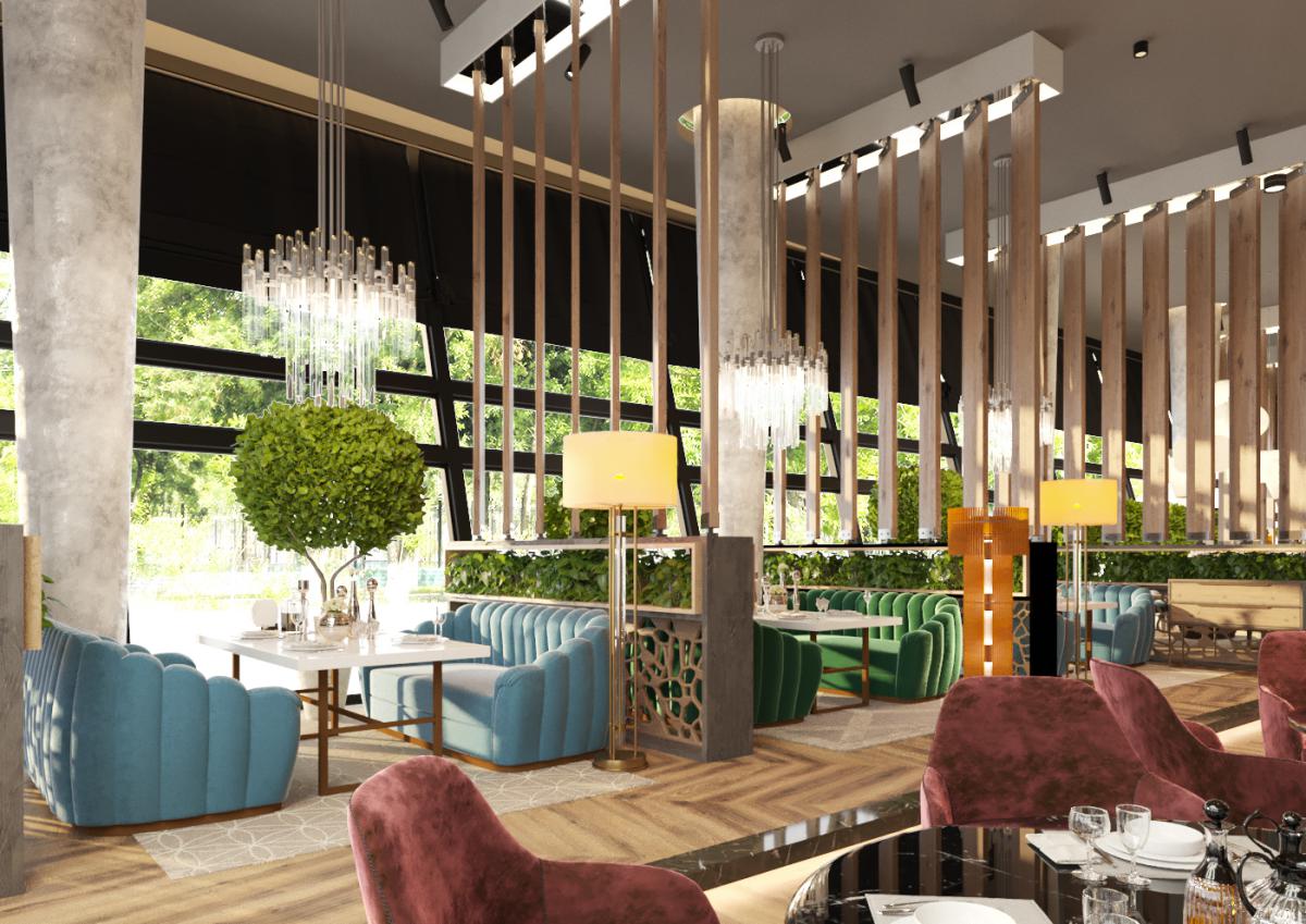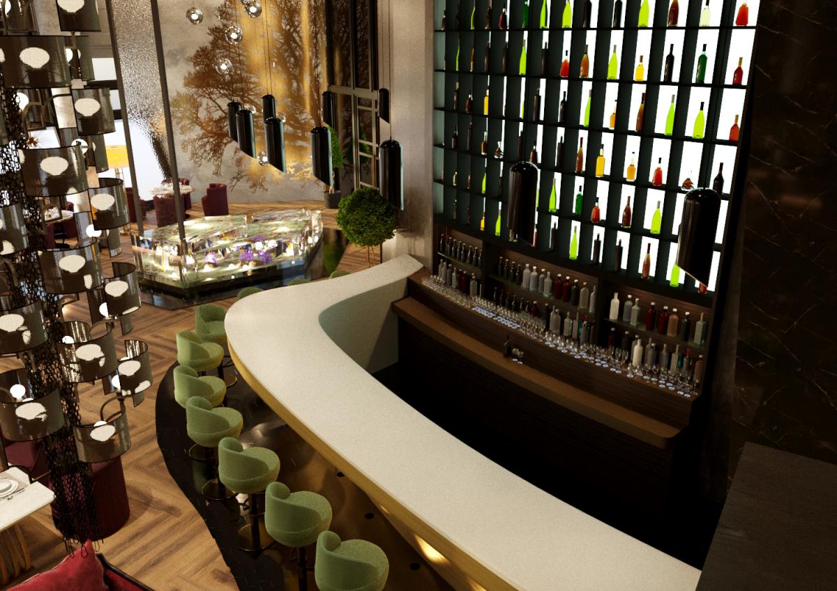 In the center of the room, as a reminder of the garden, grows a royal magnolia. In the hall you can even see an aquarium with sea fish, which in the future the chef will cook especially for you. Another gastronomic highlight is the outdoor barbecue area. Nearby is a large streamlined bar with a tabletop made from Korean. Along the windows there is a landing with comfortable soft sofas that are shared by huge giant slab screens. Screens mimic the trunks of perennial trees, and living plants in the niche of these trees. Relaxing on a comfortable sofa and tilting your head up, visitors will see an unusual installation at the very top. The installation on the ceiling imitates scattered circles of the sun and is made of lightweight cork bars. The sun theme is continued by the Italian pendant lamps BLS from the Raimond collection and Copper Shade by Tom Dixon lamps.