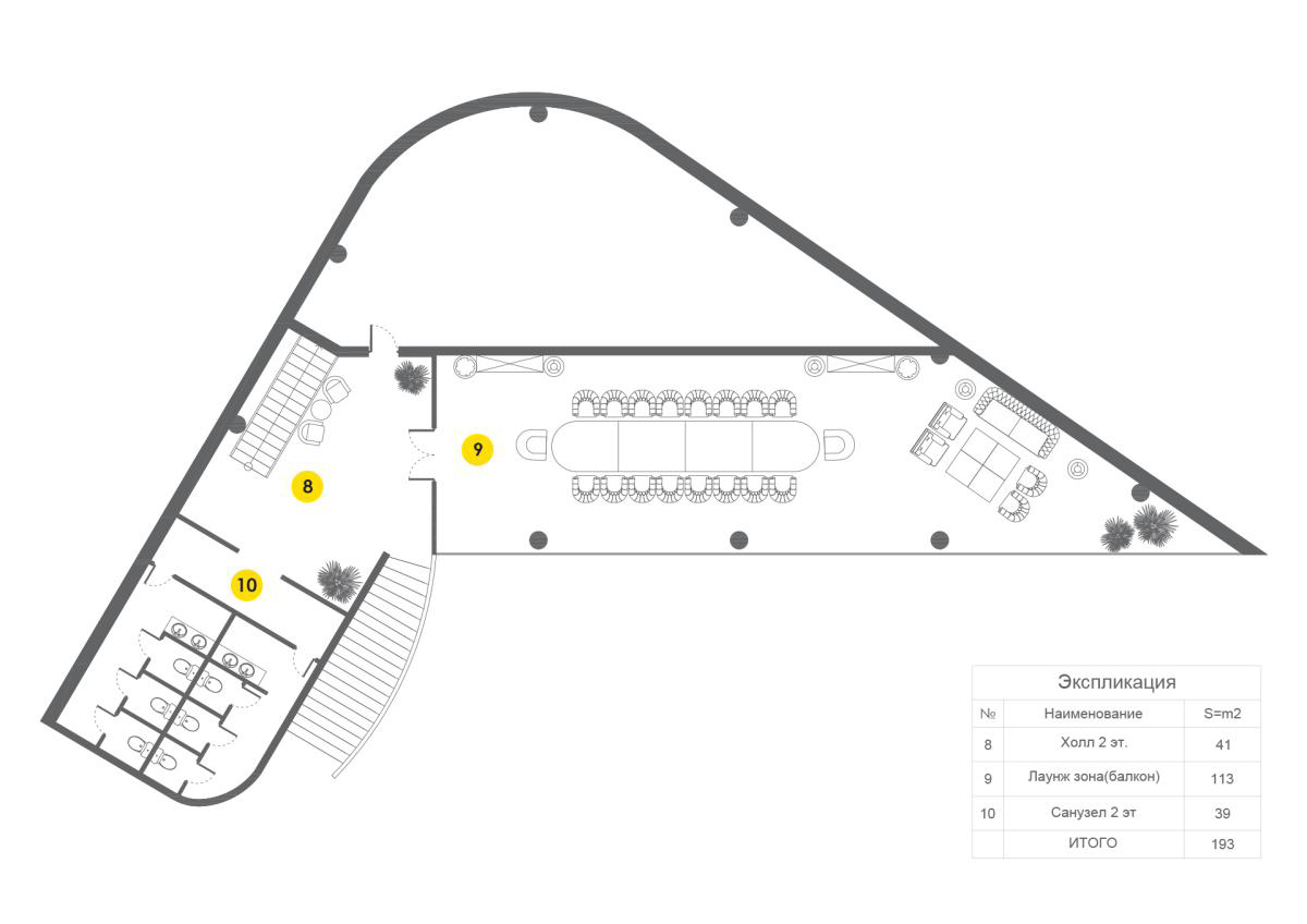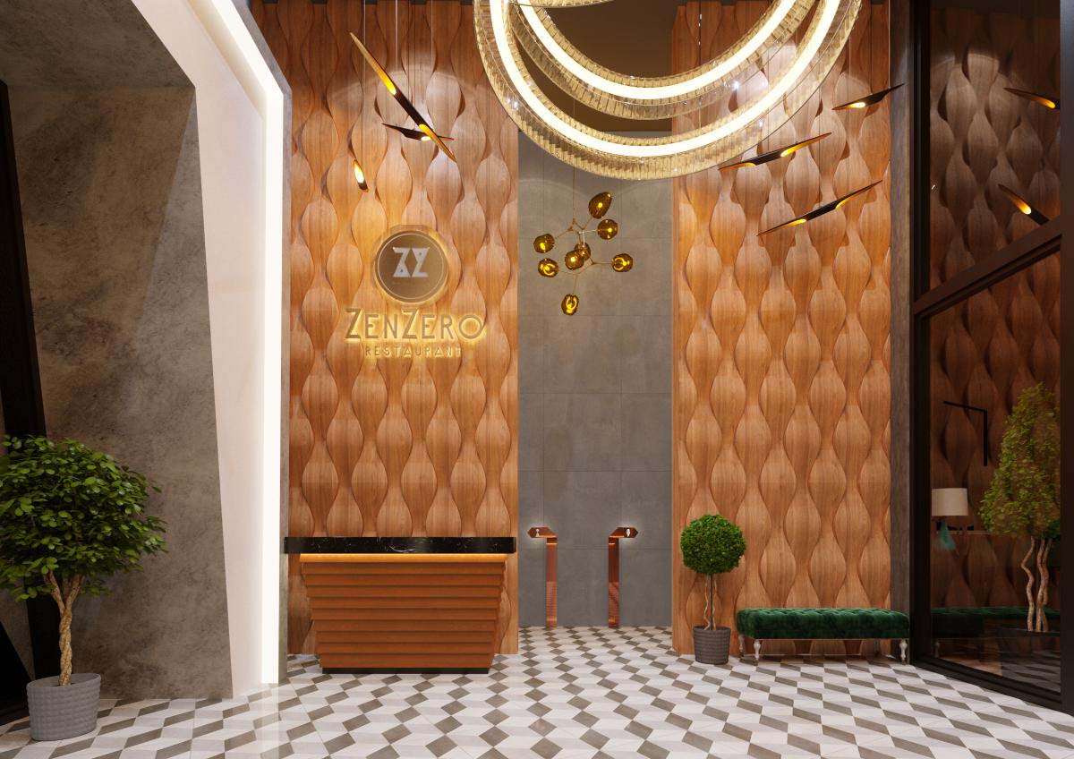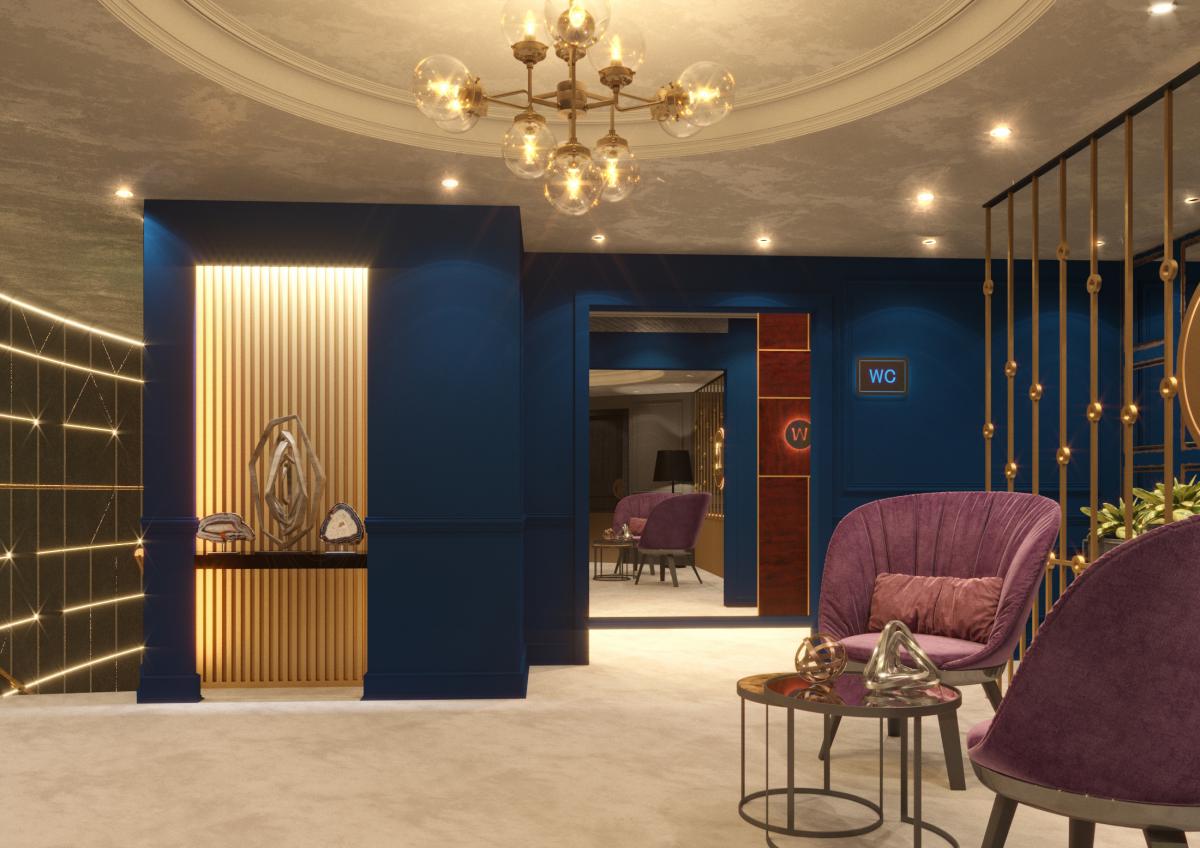 The concept was to create an interior that is as transparent as possible and is close to living nature. The first thing that needed to be done was to distribute all the zones so that a new view would open from each point. The second is to beat the height of the ceilings. High ceilings allowed us to use volume chandeliers. In the center of the lobby are a chandelier in the form of rings and the famous Delightfull Coltrane fixtures, suspended at different heights. The cloakroom is highlighted with slats, veneered under golden oak.