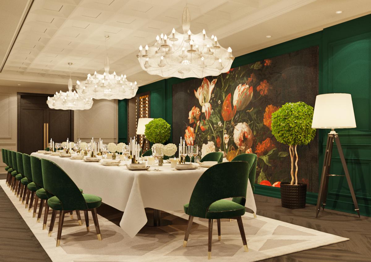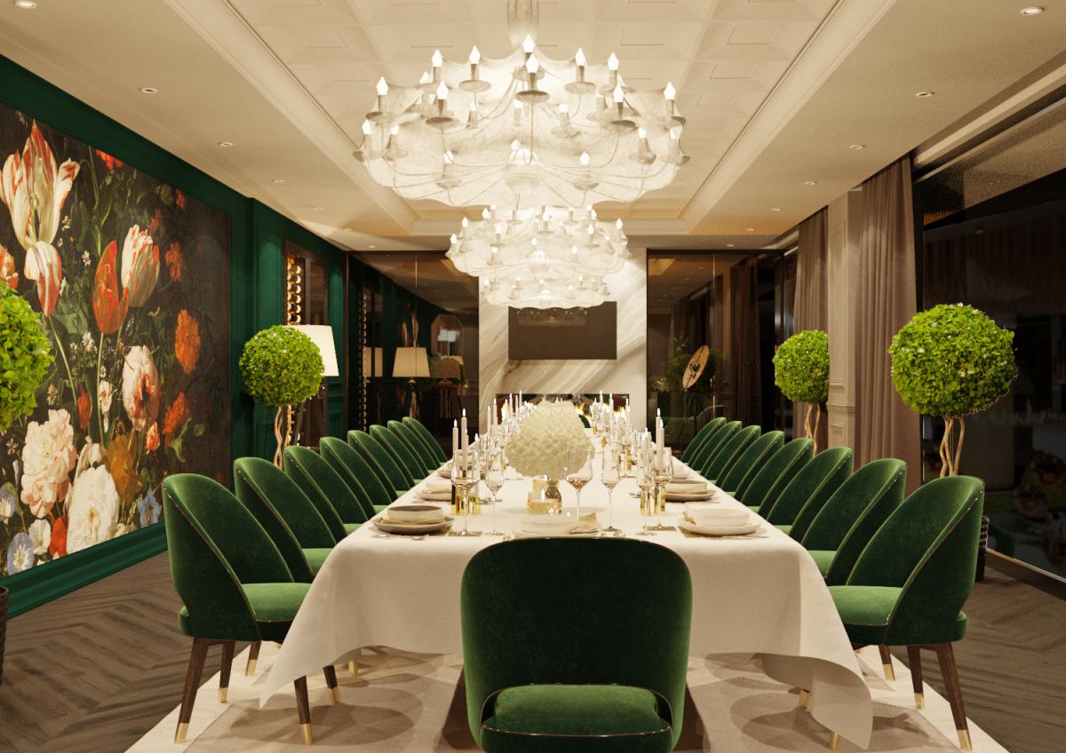 On the second floor there is a VIP room. The interior here is more restrained. On the first floor they mix modernism, hi-tech, neoclassicism, fusion, on the second the basic neoclassical style. Among the classic wall decor, we suggested painting in the style of a Dutch still life, with two wine coolers on either side. In the center of the hall a large table. Carefully selected the lighting for the VIP area and settled on the Flos Zeppelin chandelier by the Dutch designer Marsel Wanders. At the end of the hall there is a partition with marble trim and a biofireplace, which can be seen from the back side in the recreation area.