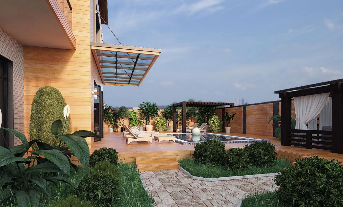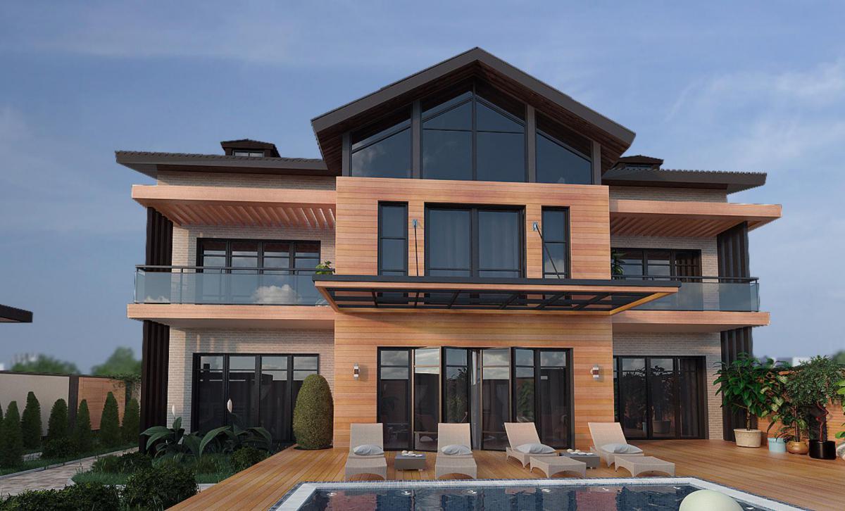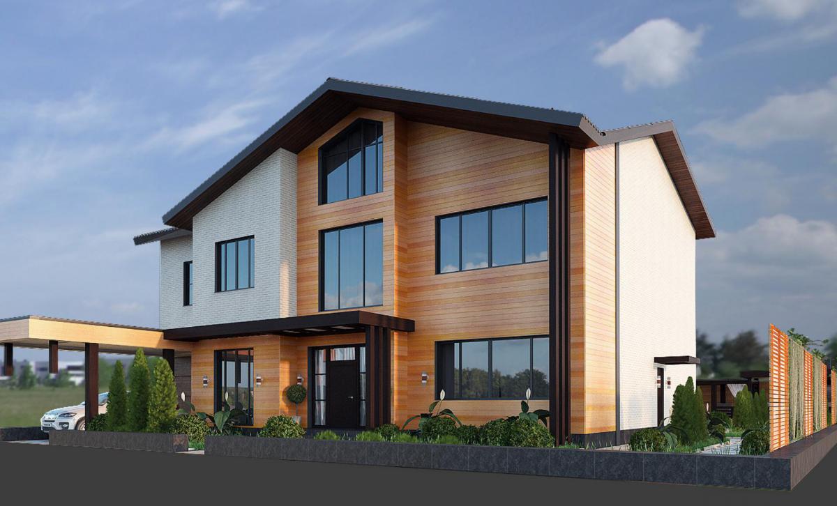 The private house with the adjacent plot is made in high-tech style. White cladding bricks were used for the facade, WPC panels of golden oak, metal and wenge wood in combination with panoramic glazing were used. The facade of the house has a strict geometric shape. The site is compactly located carport, summer kitchen area, swimming pool and minimalist landscape compositions along the perimeter of the site