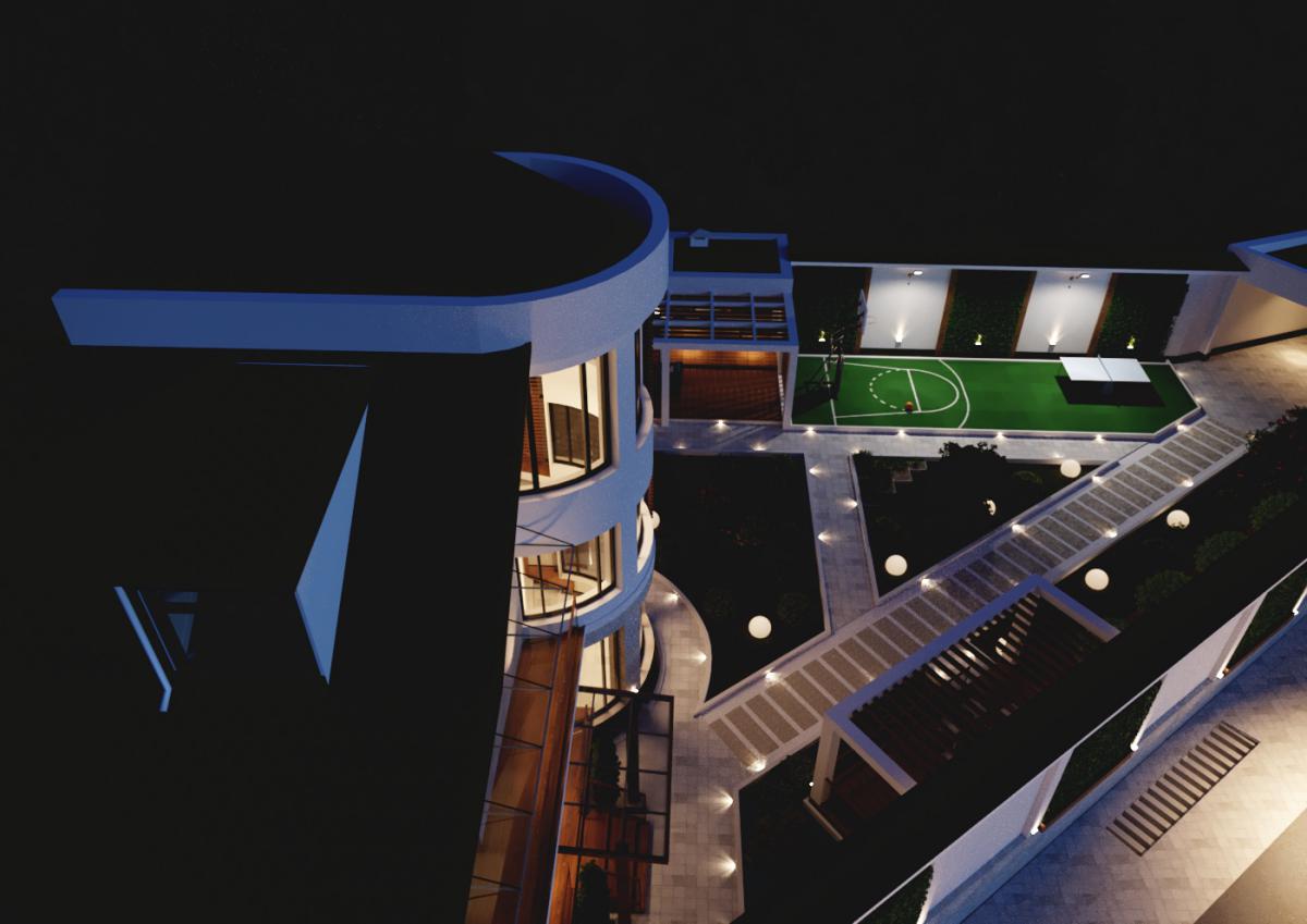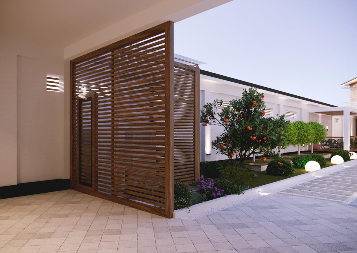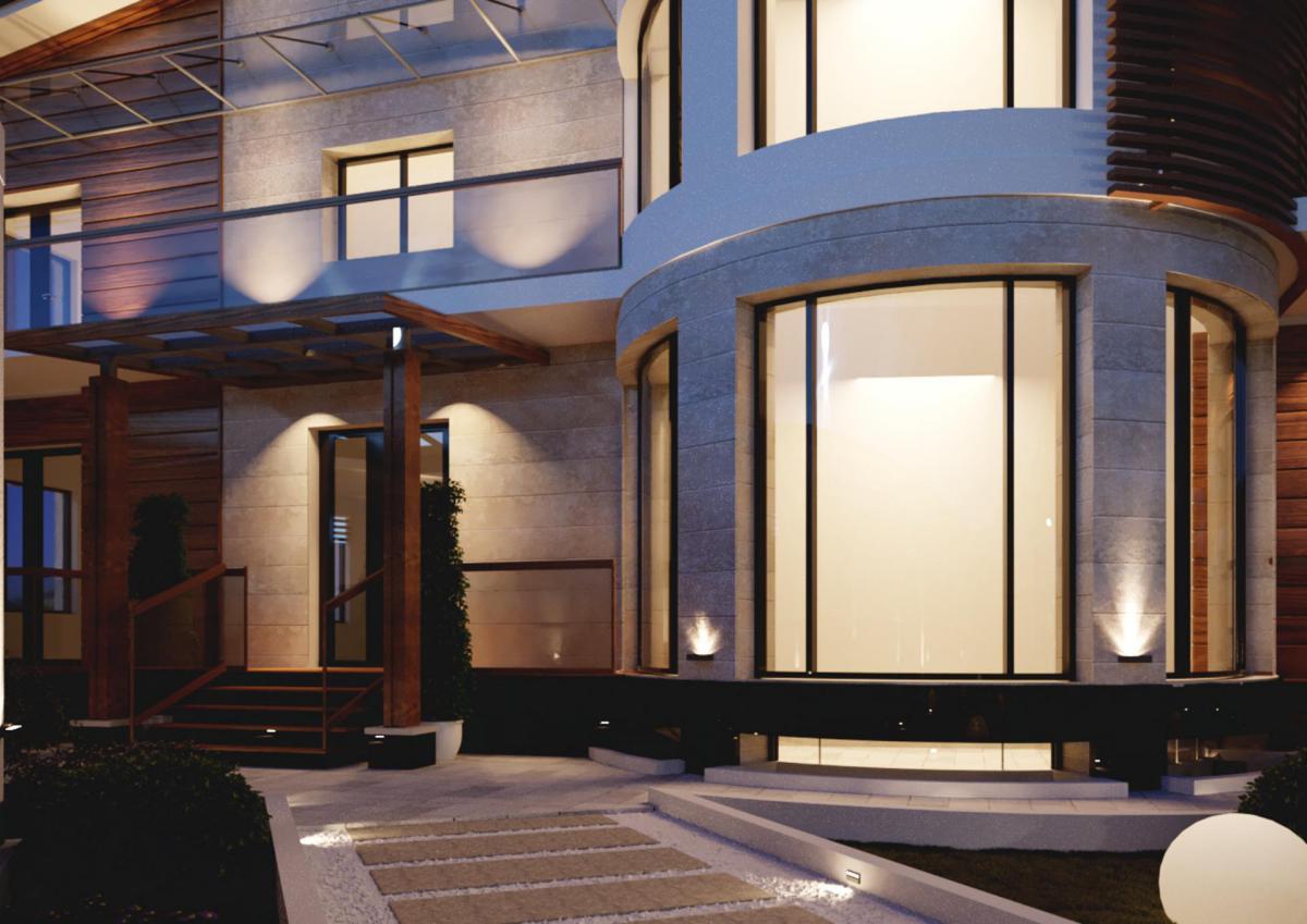 To do this, we proposed to use WPC panels under the tree, the usual painting in white, travertine and granite. Due to these materials, we made the facade play with semitones and contrasts. Complement the picture window frames in anthracite and glass canopies, hung on elegant metal cables. In a very detailed and delicate way, our studio approached the facade lighting. The shape of the lamps, their location, the color of the lamp and how it will shine were carefully considered.