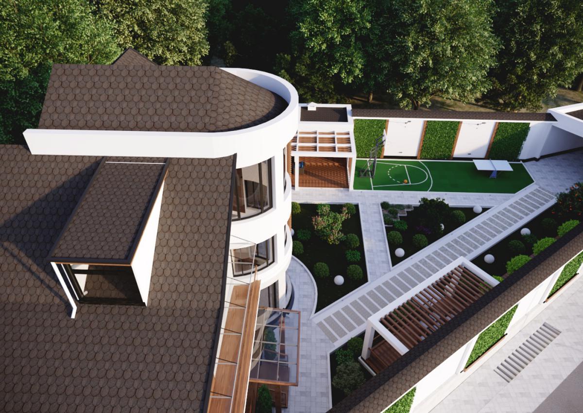 The landscape of the site was also developed separately. For the tracks and curbs we used the same travertine as on the facade. The plot turned out to be multifunctional, as the summer kitchen, swimming pool, sports field and green areas for landscape compositions are located here.