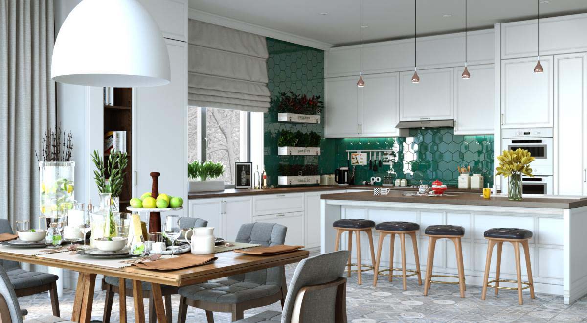 On the ground floor there is a kitchen, living room, dining room, bedroom and laundry. American-style kitchen with snow-white facades and milling, handmade apron from ceramic tiles. In the center of the kitchen is such a characteristic American-style kitchen island, where an additional working area is located on one side, on the other, a bar counter.
