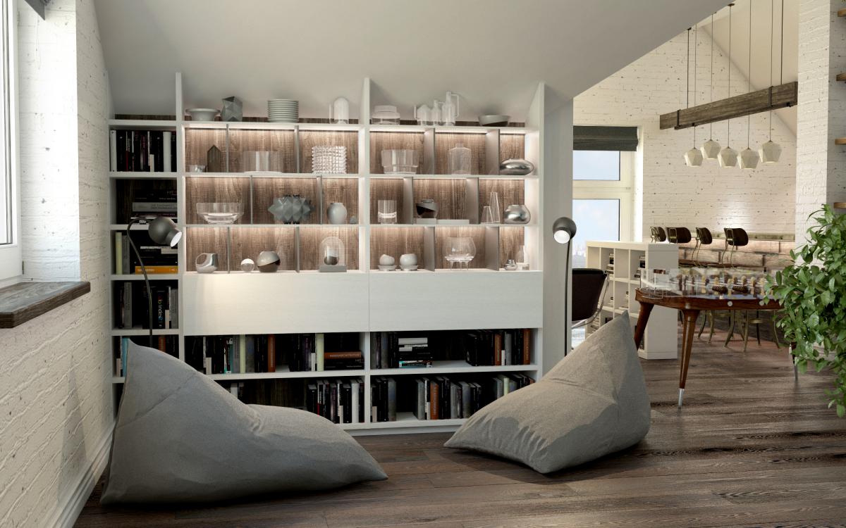 On the last attic floor there is also a corner for both the child and the adult. Here we have placed a study, archive, lounge area, bar and even a hammock. The style of the attic floor is close to the loft; the place itself has set us up to this style. We filled the space to the maximum, engaged every corner and did not even miss the opportunity to hang the Bubble chair art armchair on the beam.
