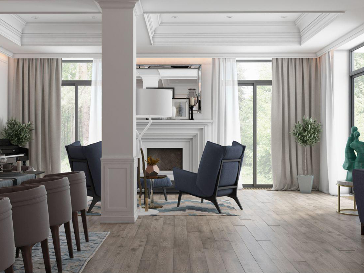 The living room has another dining area for guests. Lamps above the table by designer Tom Dixon add eclecticism to the interior. The walls are white with classic drafts in contrast with dark furniture and wood. The atmosphere of the living and dining area has to rest, especially when you are sitting in soft, enveloping chairs and watch the fire burn in the fireplace, and the piano sounds caress the ear next to it.