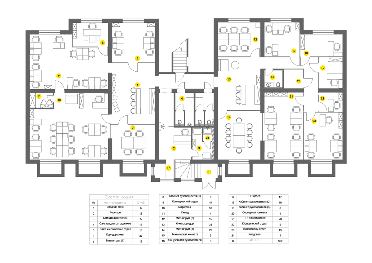 The office is located in the basement. In the technical assignment was indicated an approximate distribution scheme of departments. Our task is to place the necessary number of people in a certain quadrature and provide each department with natural light. To solve this problem, we maximally abandoned the deaf partitions in favor of glass. Modern technologies allow creating glass partitions with matting function.