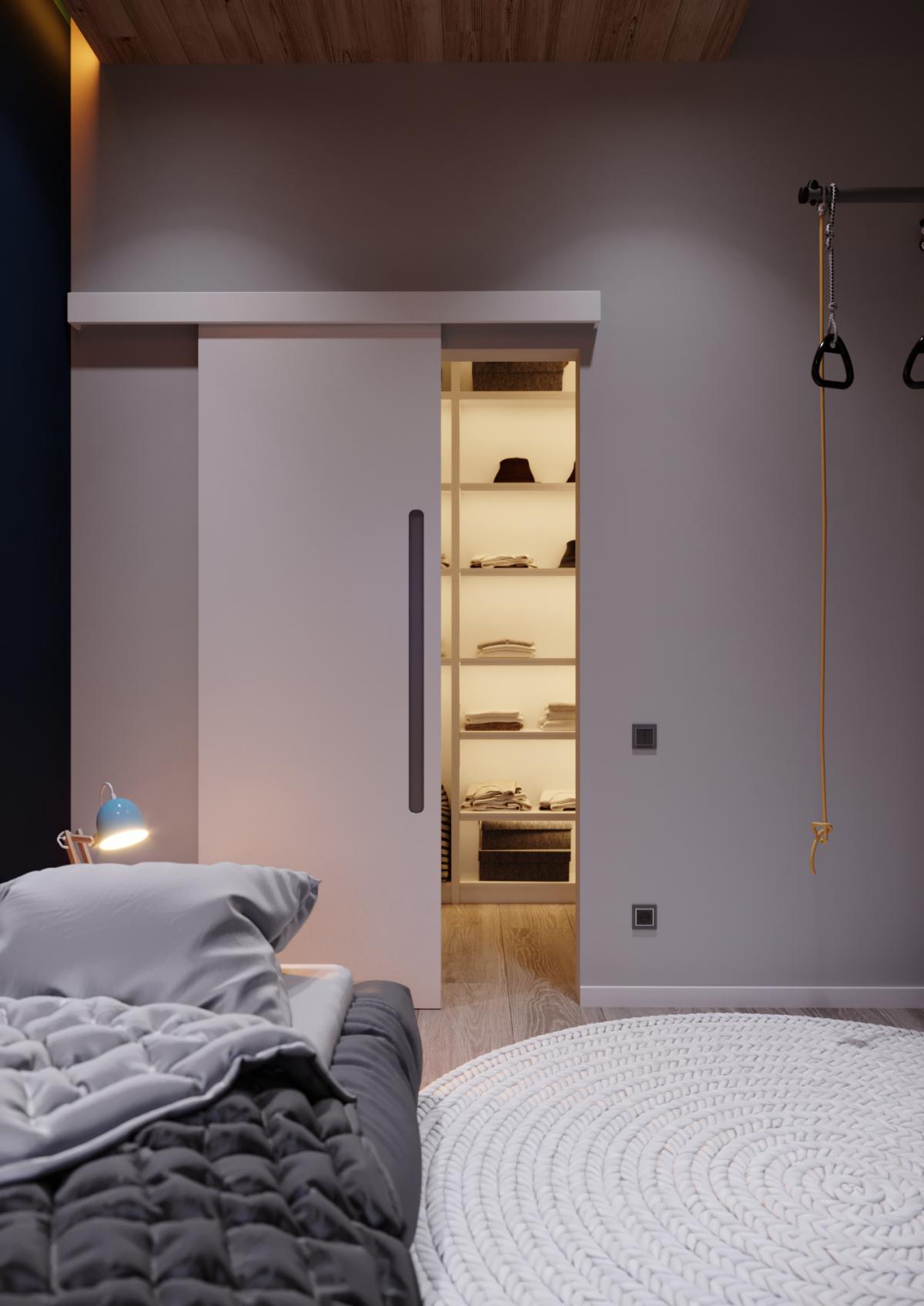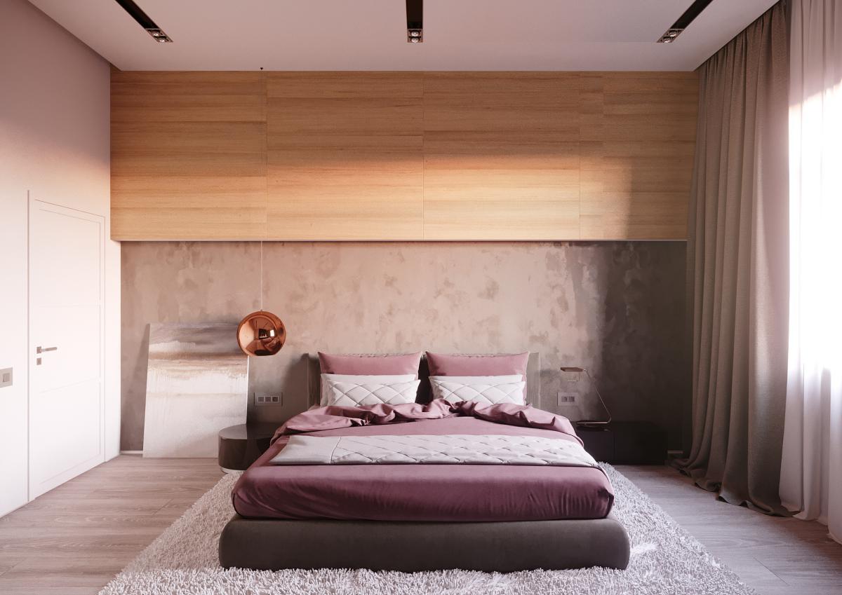 Several lighting scenarios and in the parent bedroom. With the help of highlights, we selected the texture of the walls. Whether it is decorative plaster under concrete, panels of slats or just painting, under the influence of warm light, they take on a completely different look.