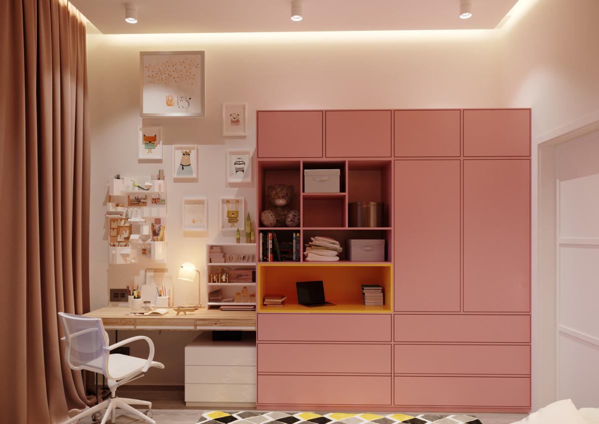 Minimalism and pastel colors in children we diluted with color. So, in the room for the girl on the wall, favorite cartoon characters go on a journey, and in the room for the boy, a bright rack harmoniously combines with a strict geometric composition on the wall. The furniture in the nursery also fits harmoniously into the interior, without glaring. At the same time, we tried to make it as functional and roomy as possible.