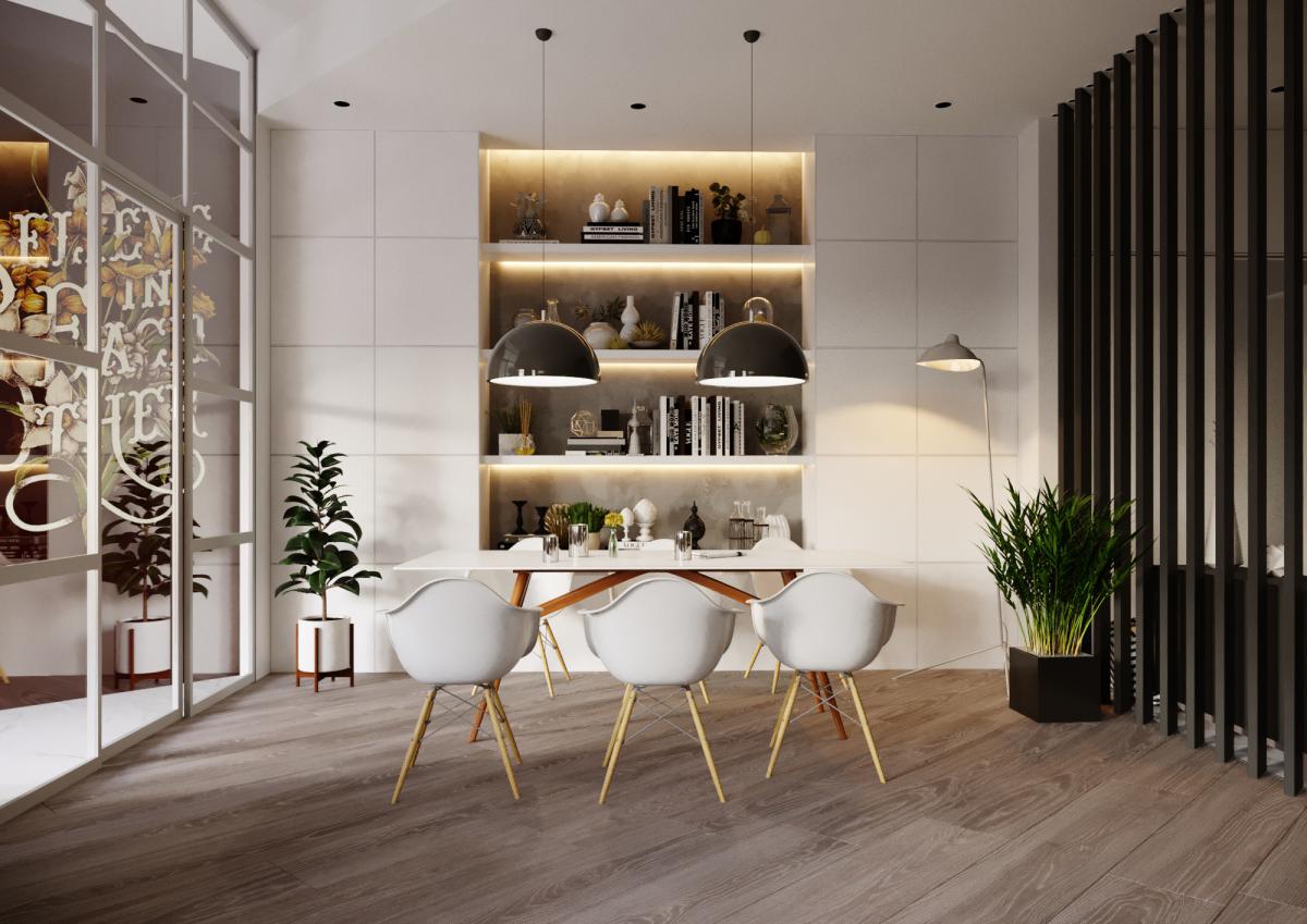 The interior is not loaded with details, very concise and functional. Each zone has its own type of lighting. In the center of the living room the Bistro Globe clear glass chandelier 16 shines diffusely, and the soft directed light from the Skygarden lamp is above the dining area.