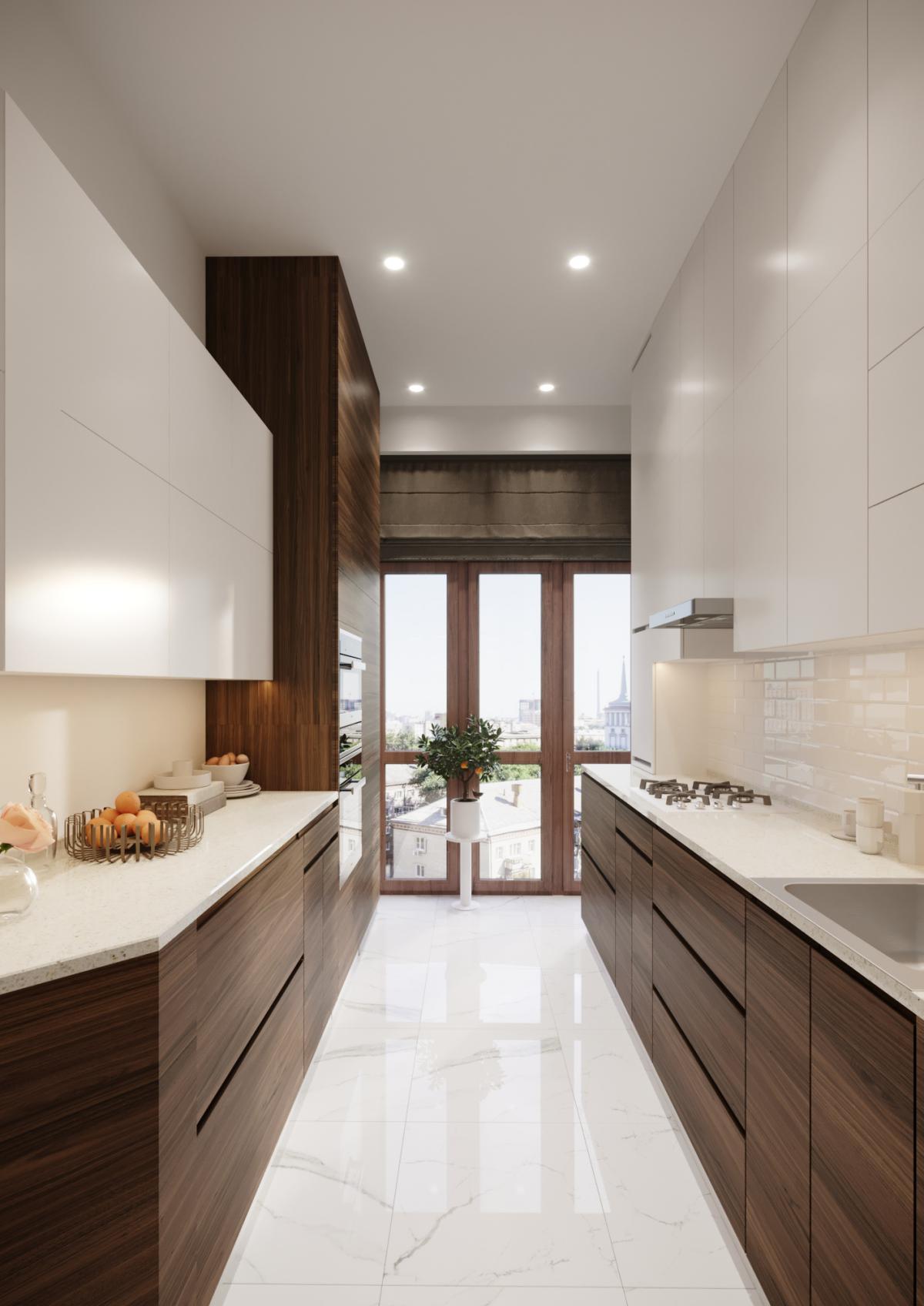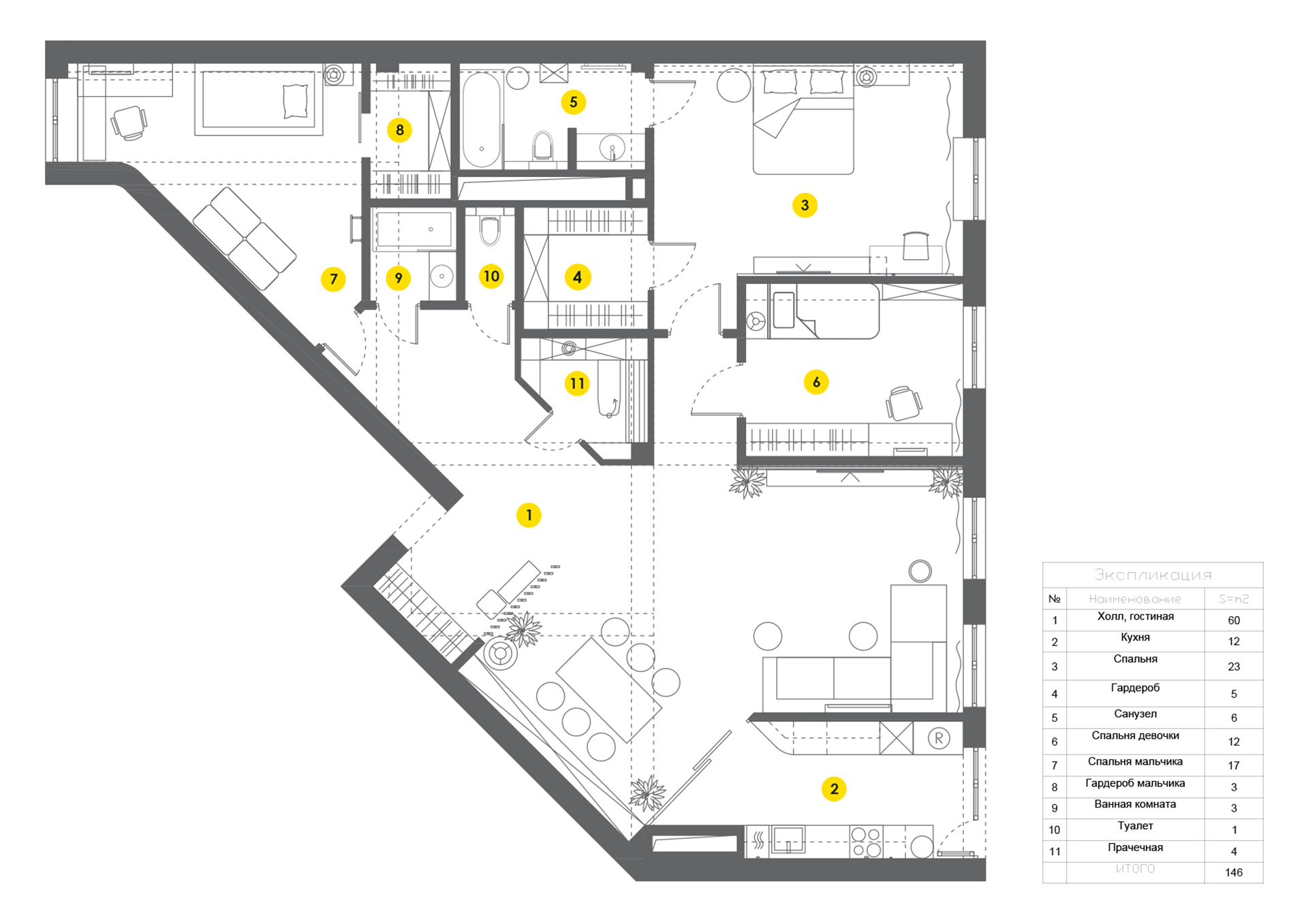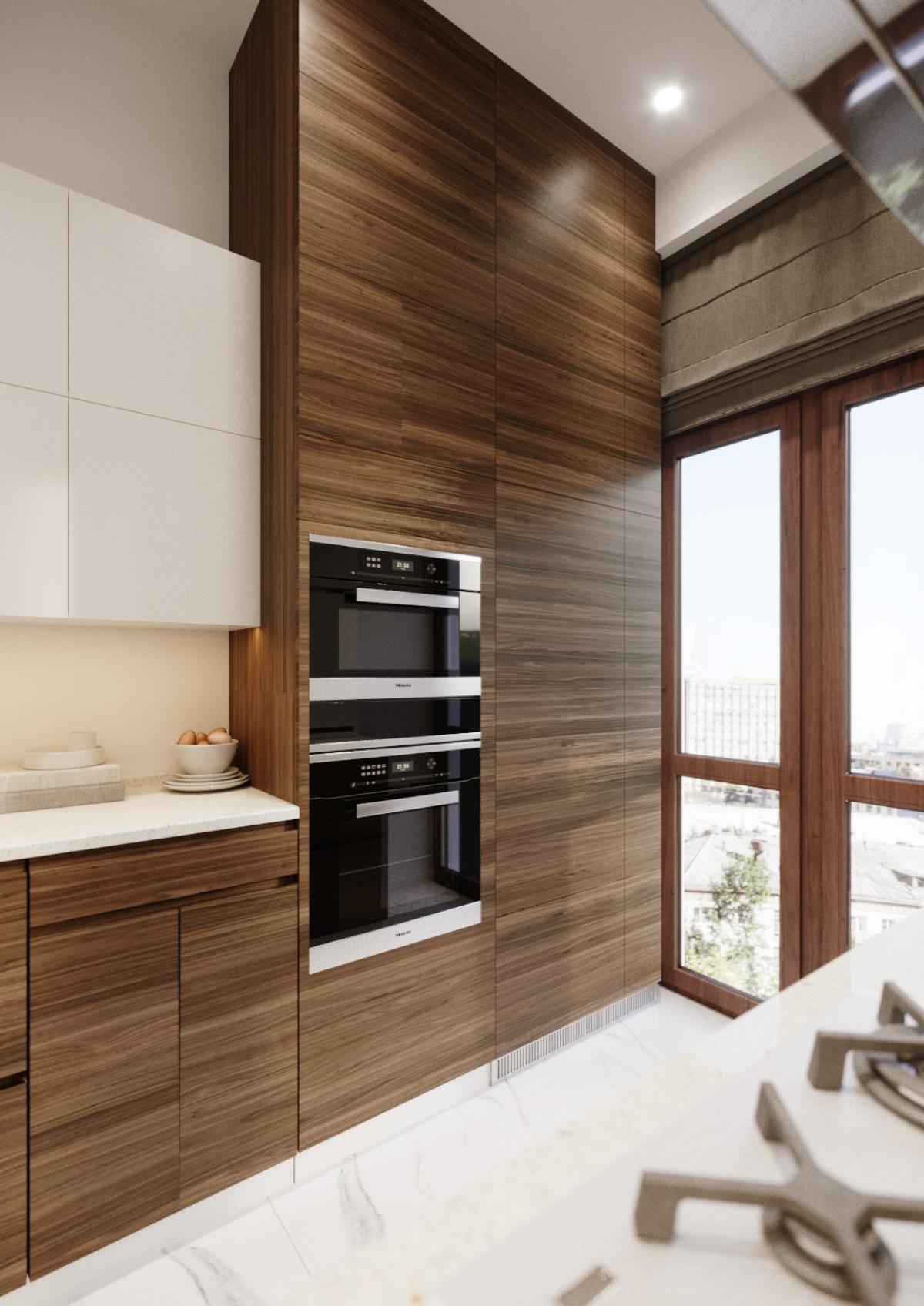 More: in terms of the apartment has a non-standard form and the task before us was to make each room ergonomic and functional. The hall and dining area are combined, the working area of the kitchen is separated by a glass partition, which creates the illusion of a holistic space.