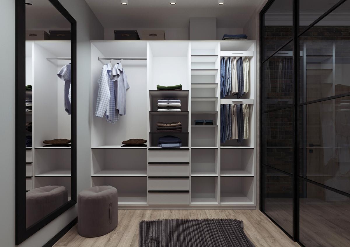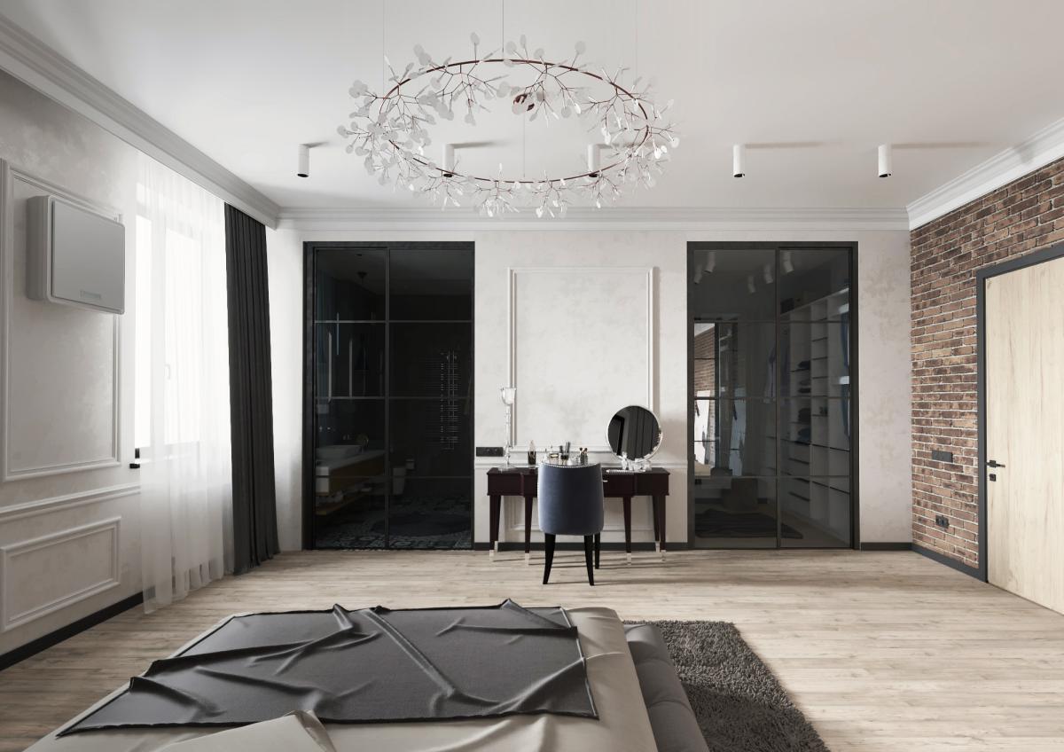 The bathroom and wardrobe are separated from the bedroom by extravagant sliding partitions in industrial style.