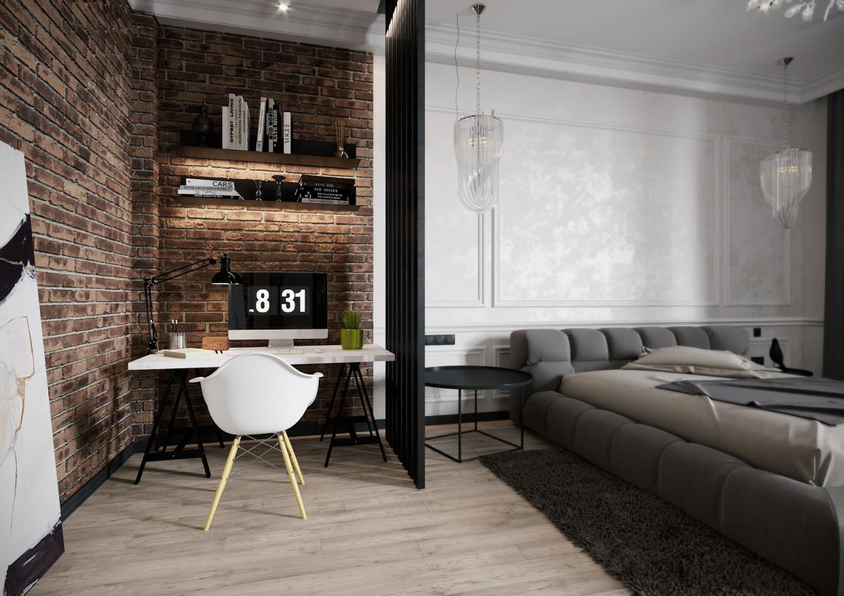 Interior of an apartment for a young family in the loft style. Studio apartment for work and leisure.