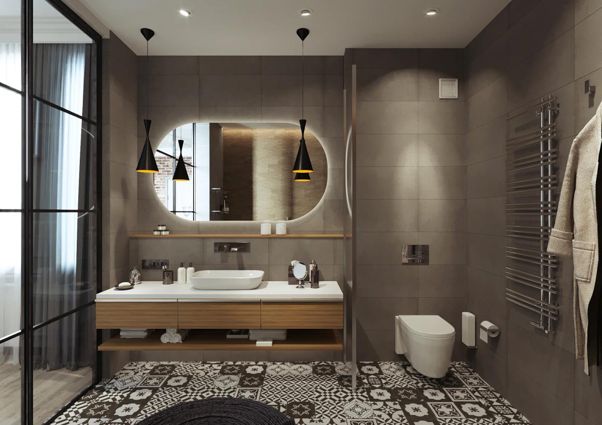 In contrast to the elegant chandelier of the Moooi Heracleum bedroom, in the bathroom we used Tom Dixon pendant lights, typical of the loft style. On the floor tile, reminiscent of the Andalusian ornament.