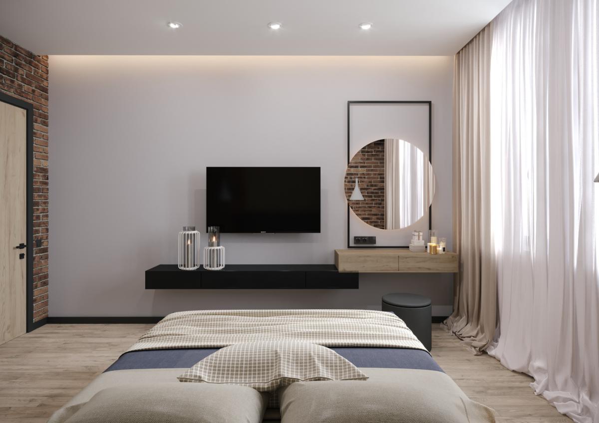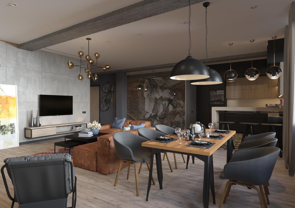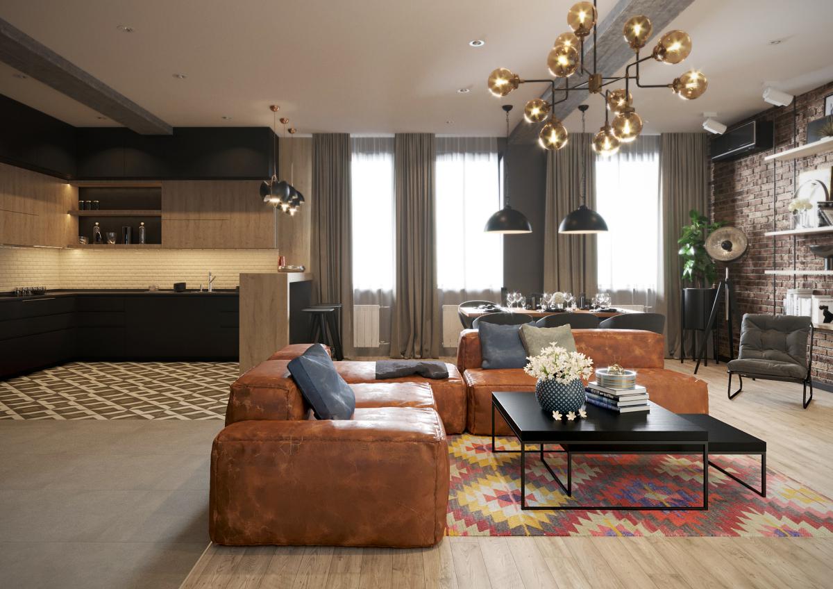 As you know, the loft style is derived from industrial buildings and suggests the presence of industrial elements in the interior (coarse decoration materials, parading communications, etc.). But our task was to soften rough details and make the interior more comfortable and cozy. The comfort in this interior is set by sand-colored curtains, a carpet with bright patterns and warm light.