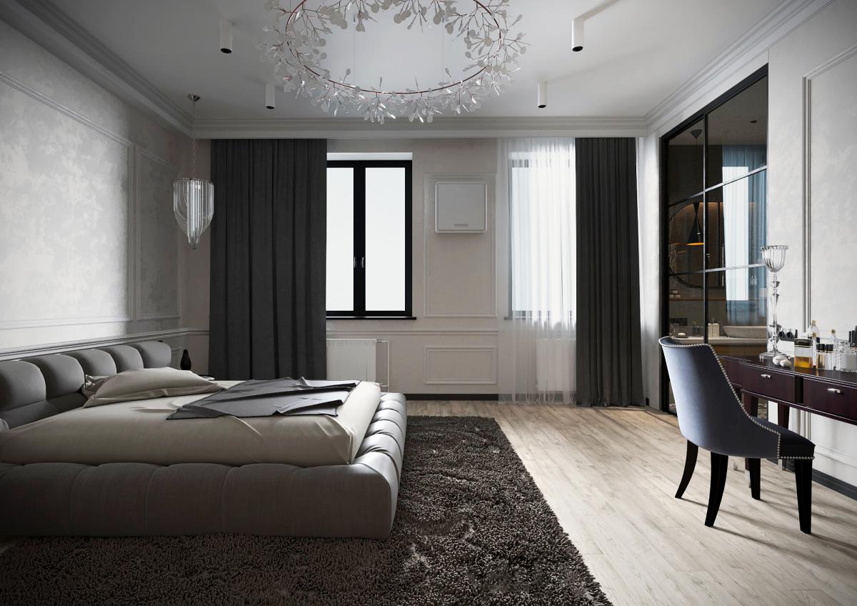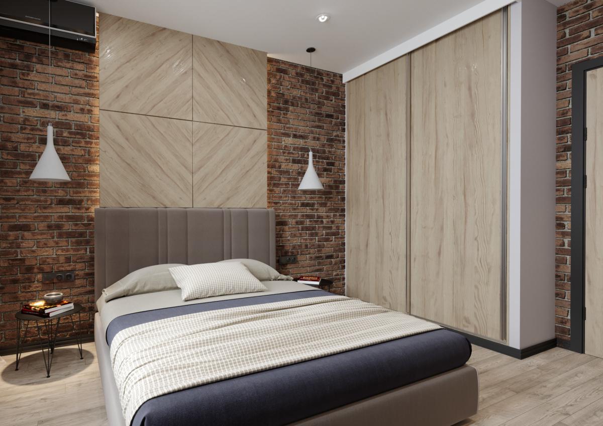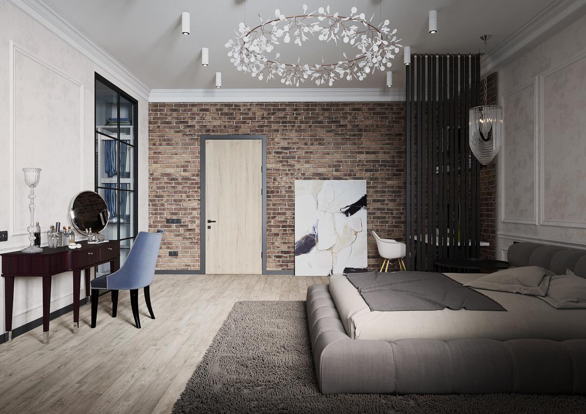 В спальне хозяев мы решили объединить казалось бы несочетаемое - лофт и элементы классики.