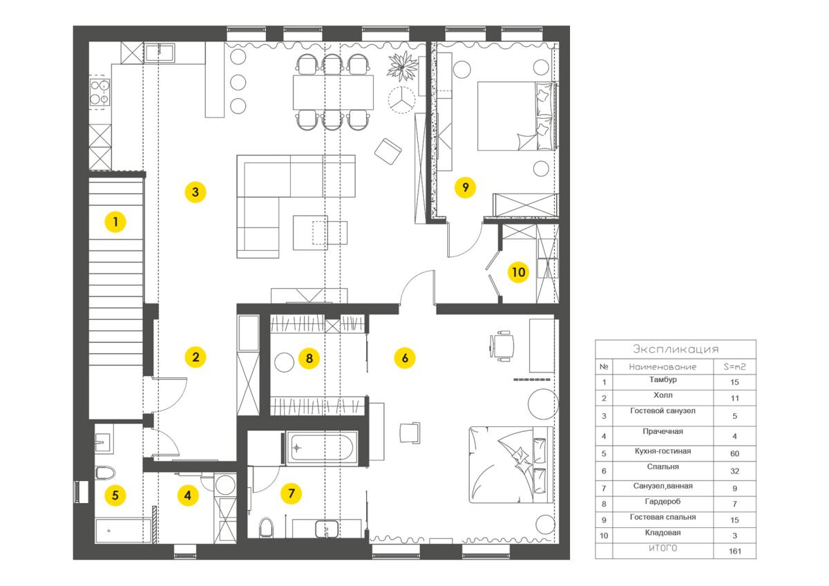 Лестничный марш мы выделили знаменитым светильником Flos Aim, который заполнил пространство хаотичными проводами и придал теплоты своим приятным свечением. Это хорошо видно со стороны гостиной, которую мы отделили большим панорамным стеклом.
