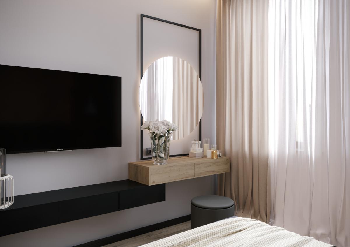 С одной стороны спальни небольшая рабочая зона с брутальной кирпичной кладкой, с другой мягкая зона отдыха на фоне нежного отточенто. Разделяют зоны металлическая ширма из черной матовой стали.